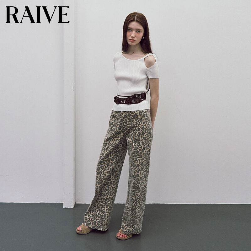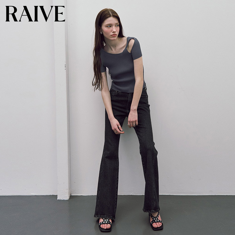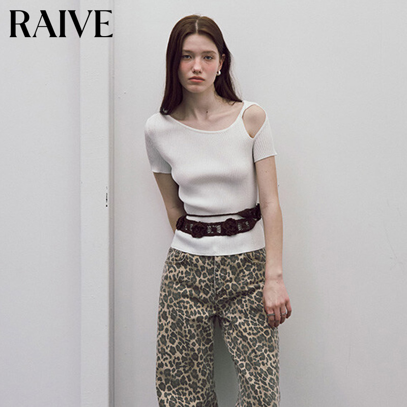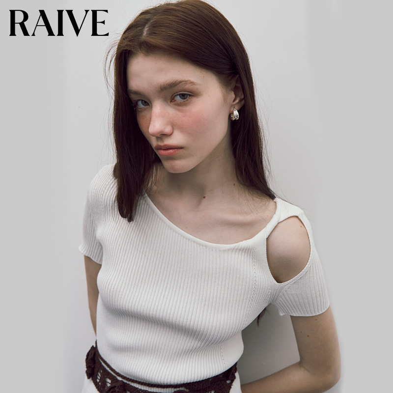 RAIVE2025秋季新款女斜领修身上衣纯色内搭扭结露肩短袖毛针织衫