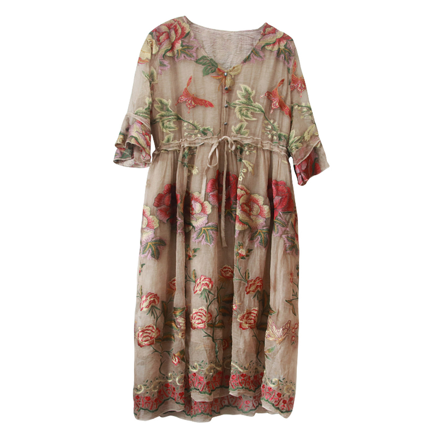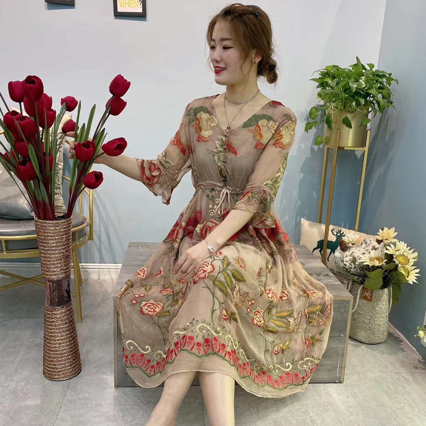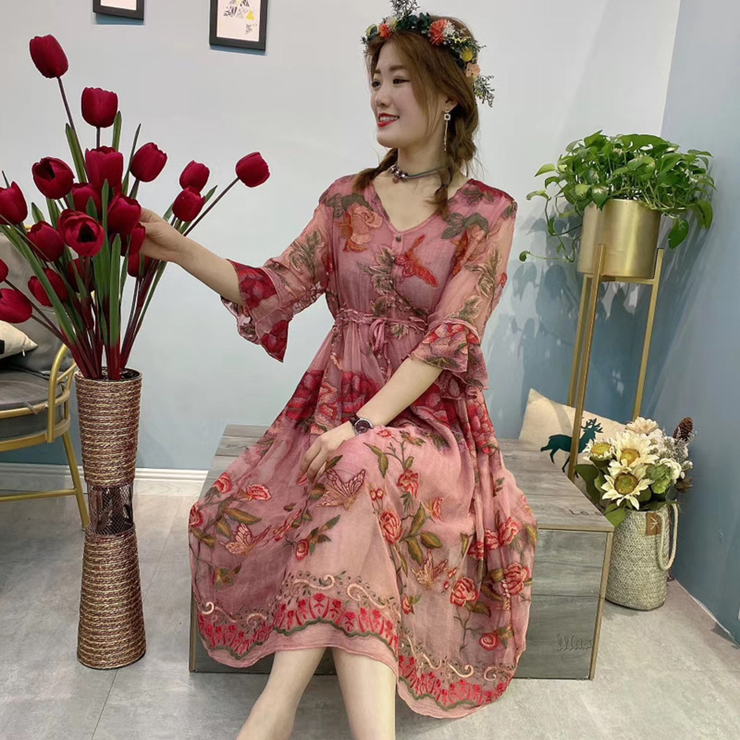 真丝桑蚕丝连衣裙大码女装减龄气质显瘦高端轻奢刺绣中长款沙滩裙