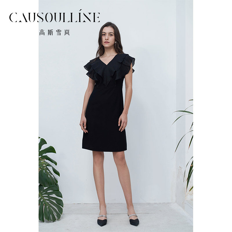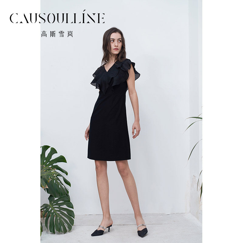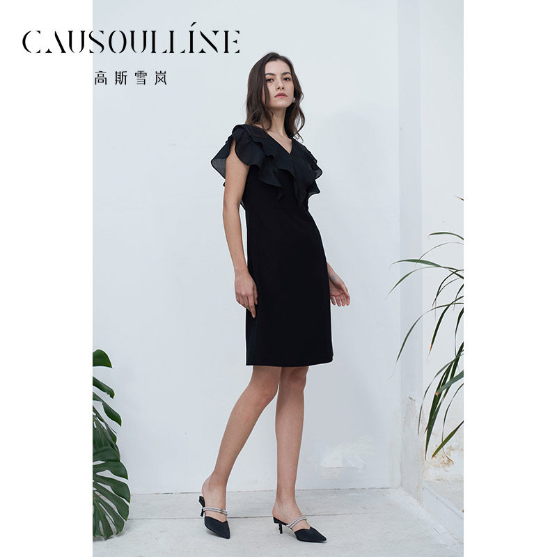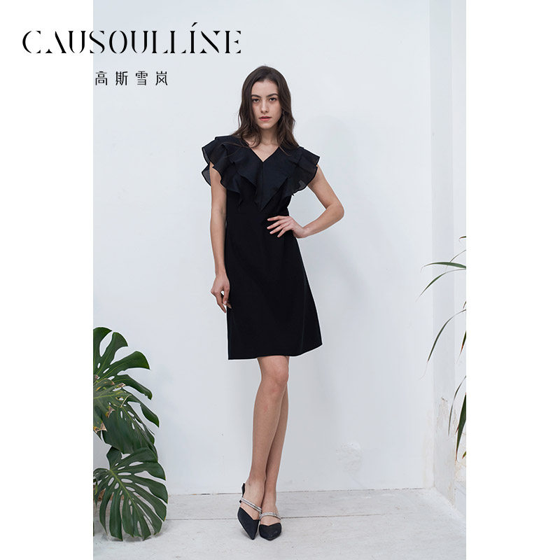 高斯雪岚2024夏季新款荷叶边优雅连衣裙显瘦纯色气质小a裙V领女裙