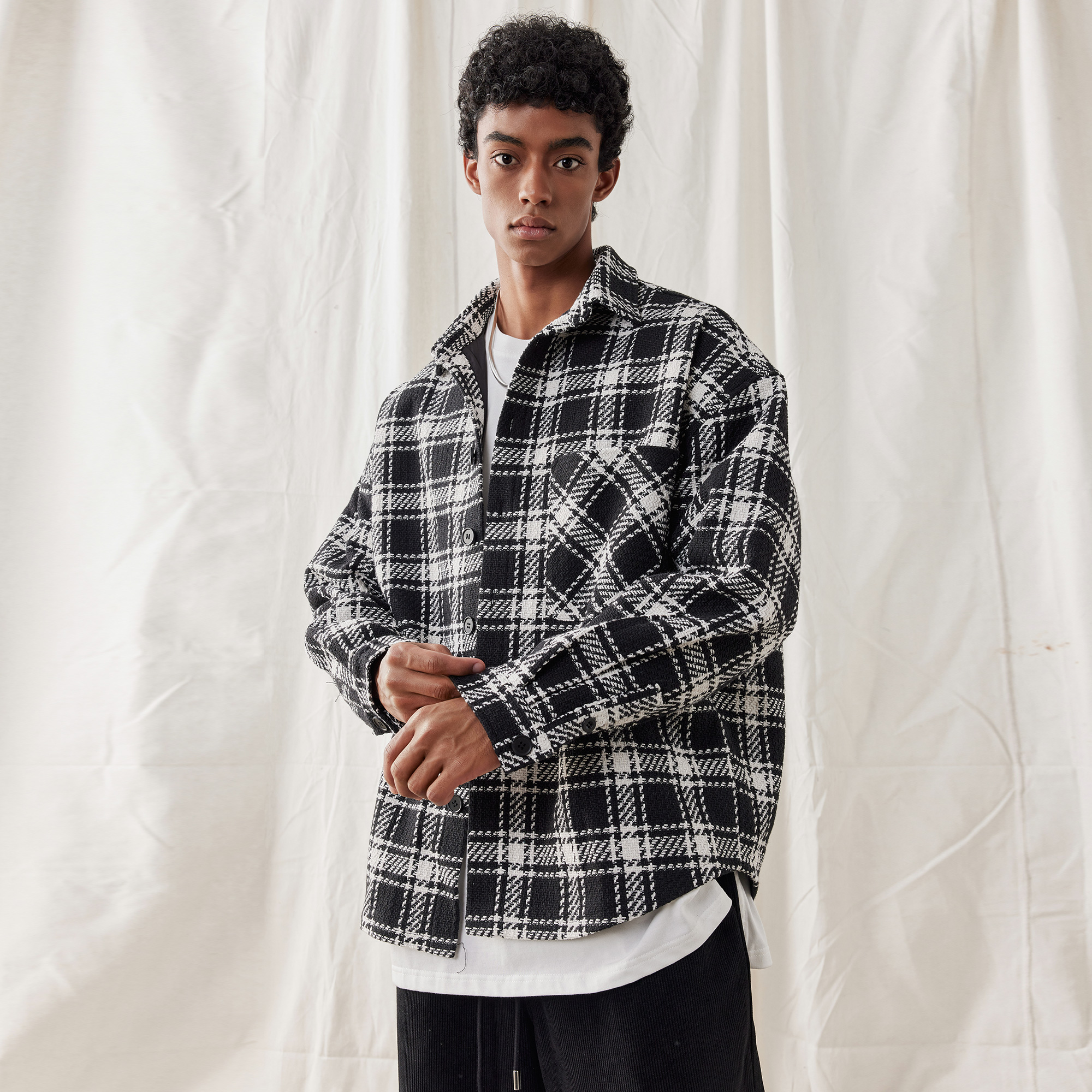 bdpowerup男女同款粗花呢编织小香风外套复古黑白格休闲宽松衬衫
