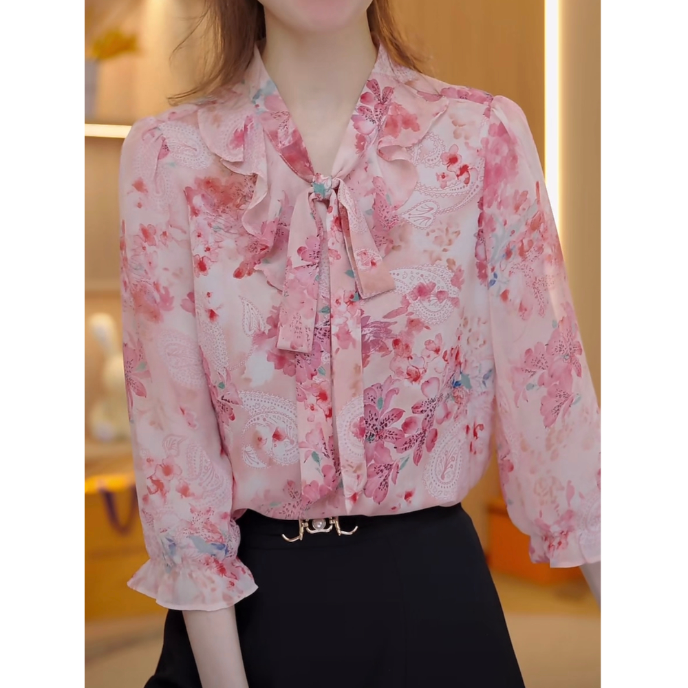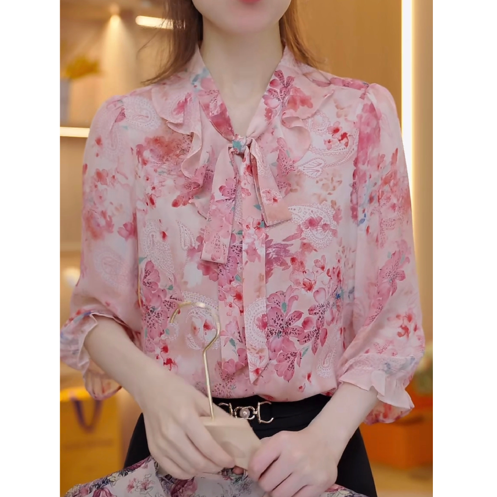 碎花蝴蝶结七分袖雪纺衬衫女春夏季新款别致漂亮小衫宽松减龄上衣