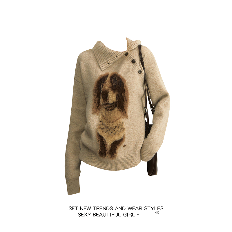 大码法式复古小狗提花针织衫女秋季胖mm宽松气质毛衣新款长袖上衣