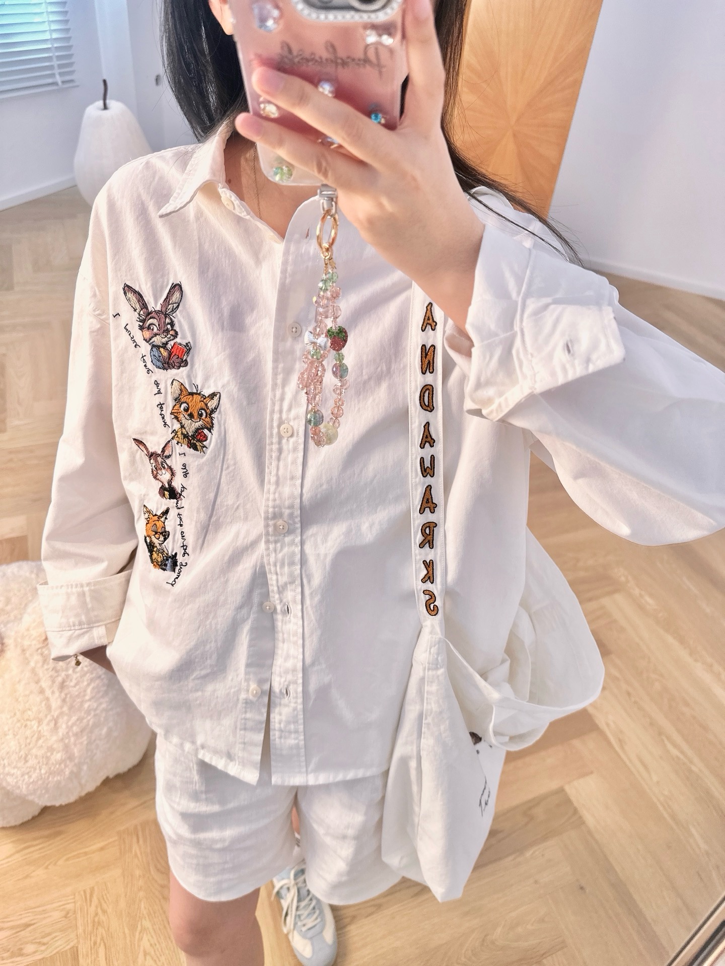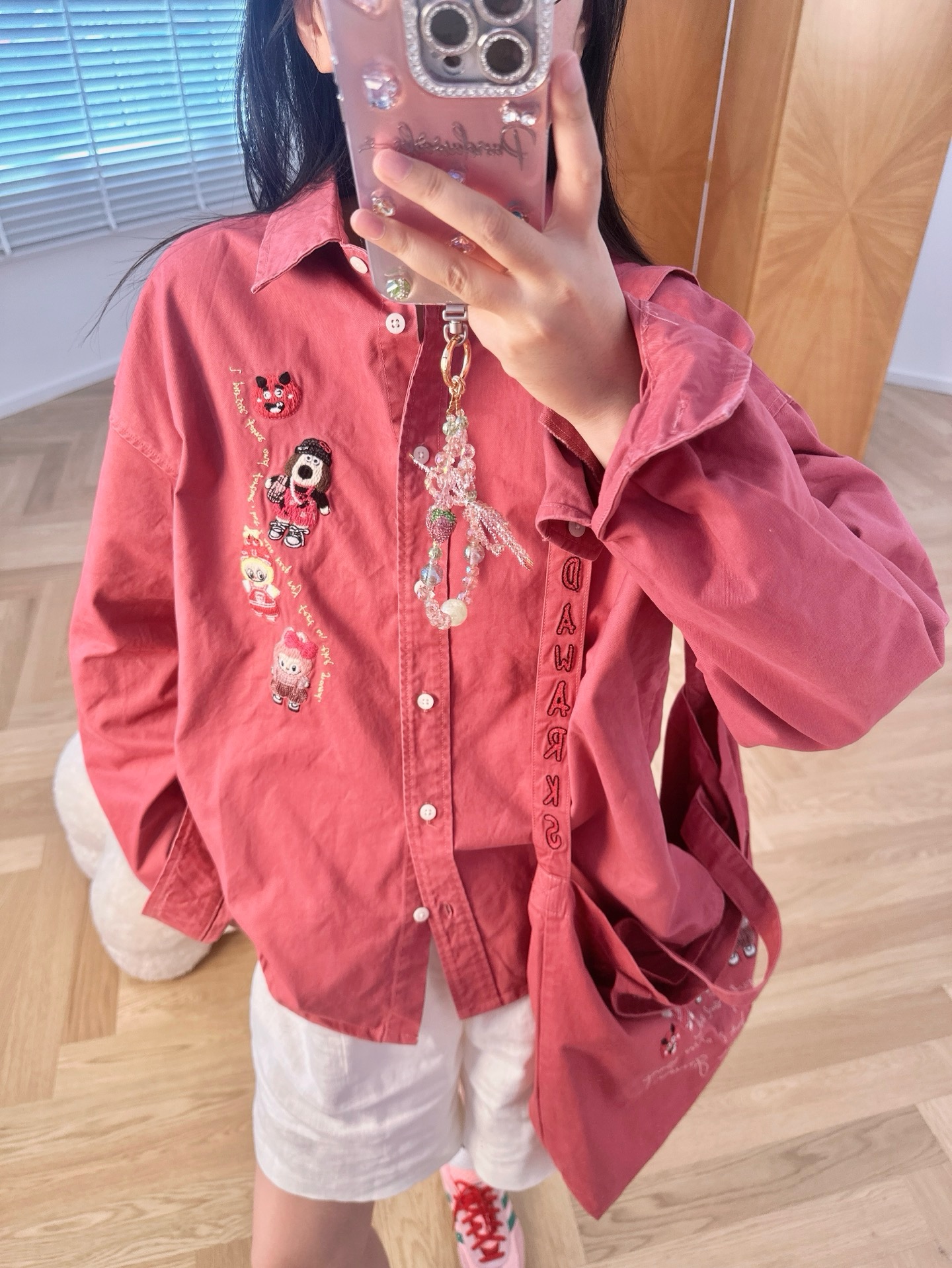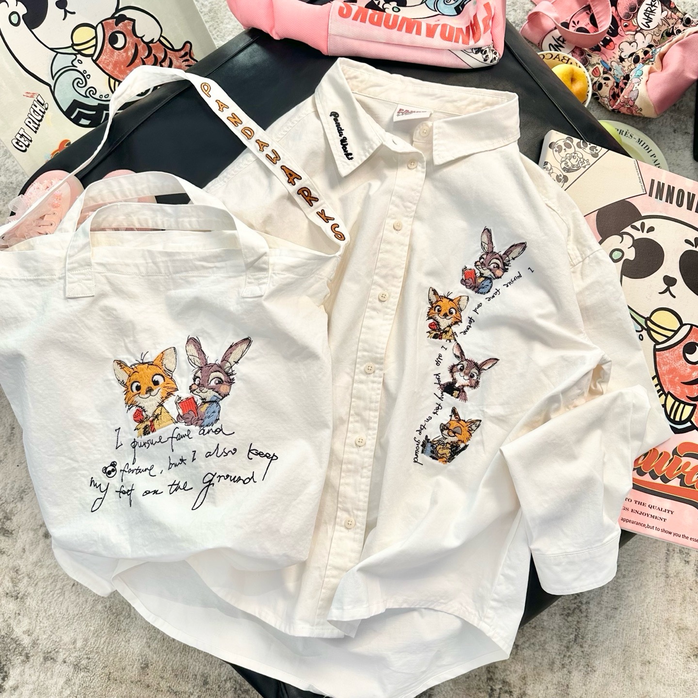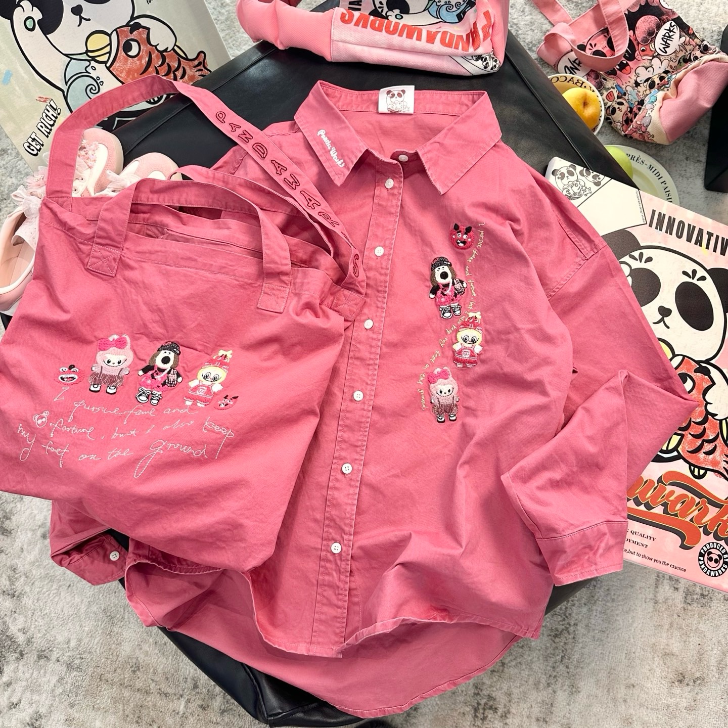 潮牌韩国东大门长袖衬衫女Pandawarks熊猫纸袋家纯棉刺绣宽松打底