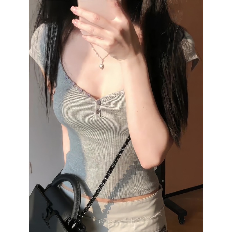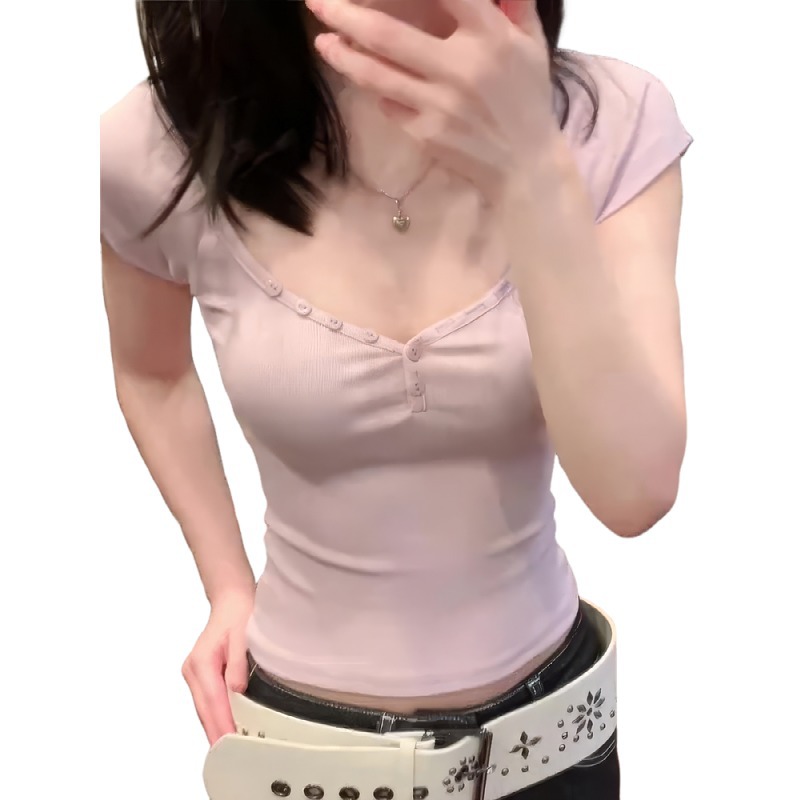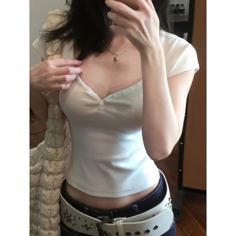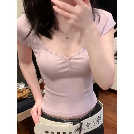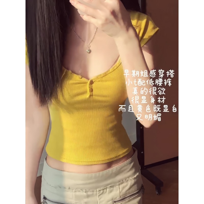 大码纯欲辣妹V领短袖T恤女装2025夏季设计感小众修身显瘦短款上衣