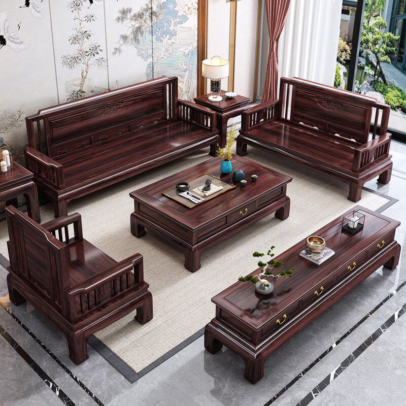 速发乌金木新中式仿古实木沙发组沙大小户型客厅转角贵妃储物合发