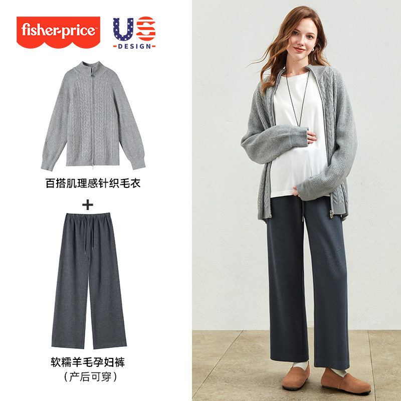 费雪孕妇装2026春秋新款针织上衣毛衣开衫孕妇羊毛阔腿裤套装冬装