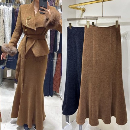 LUO法式欧货高腰雪尼尔绒鱼尾长裙女2025新冬季时尚翻领上衣套装