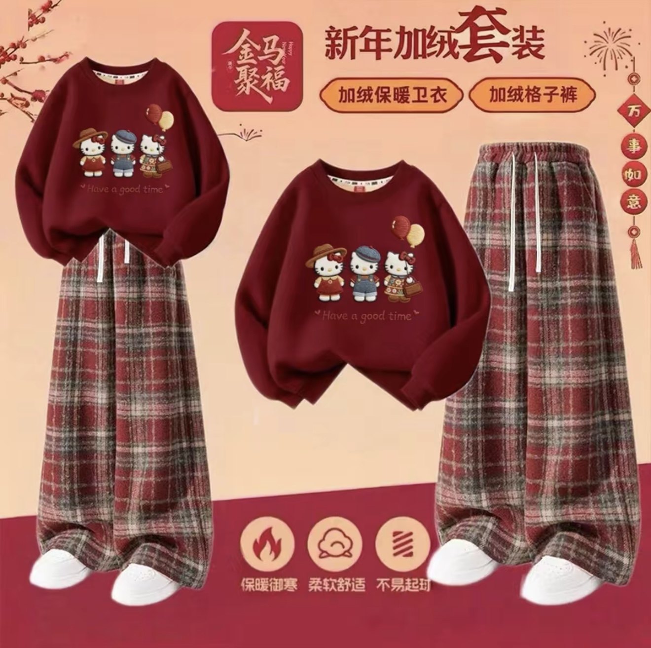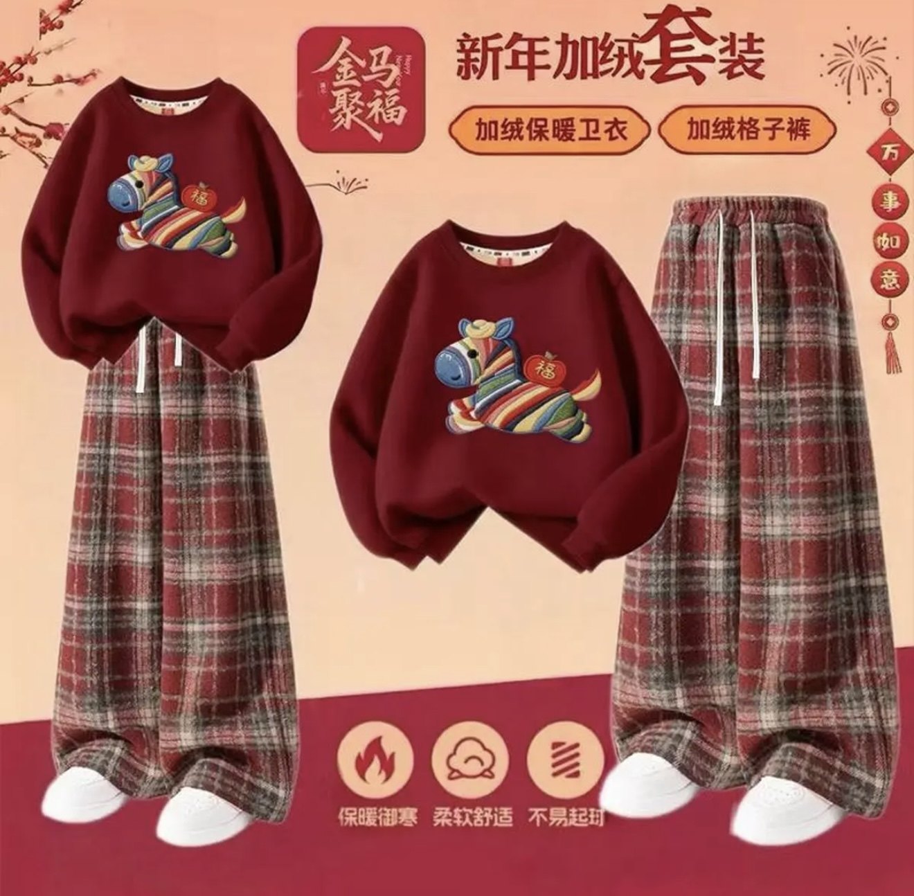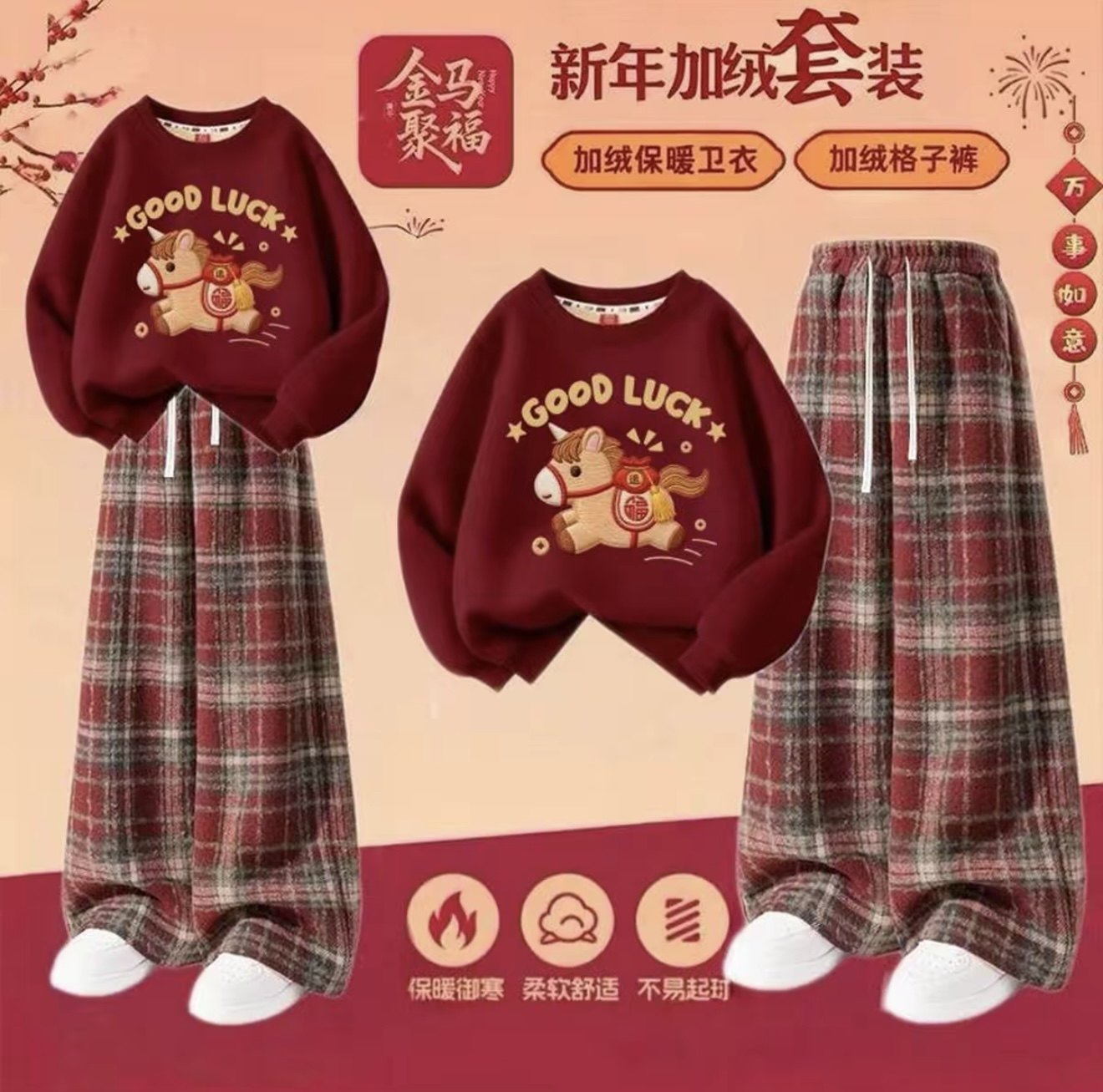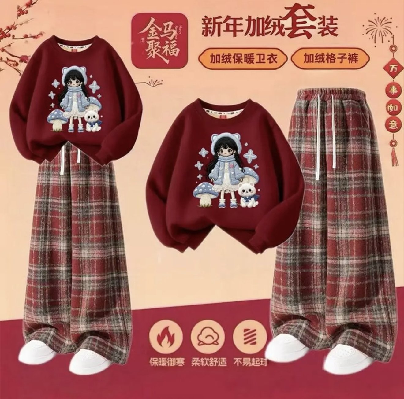 马年女童加绒套装2026冬季女孩酒红色卫衣一体绒大童裤子儿童冬装