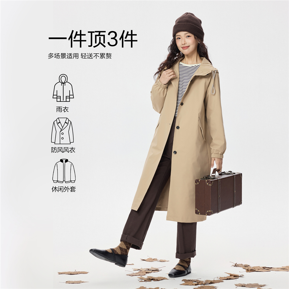 佐丹奴外套女装防水连帽插肩中长款梭织风衣外套 05375691