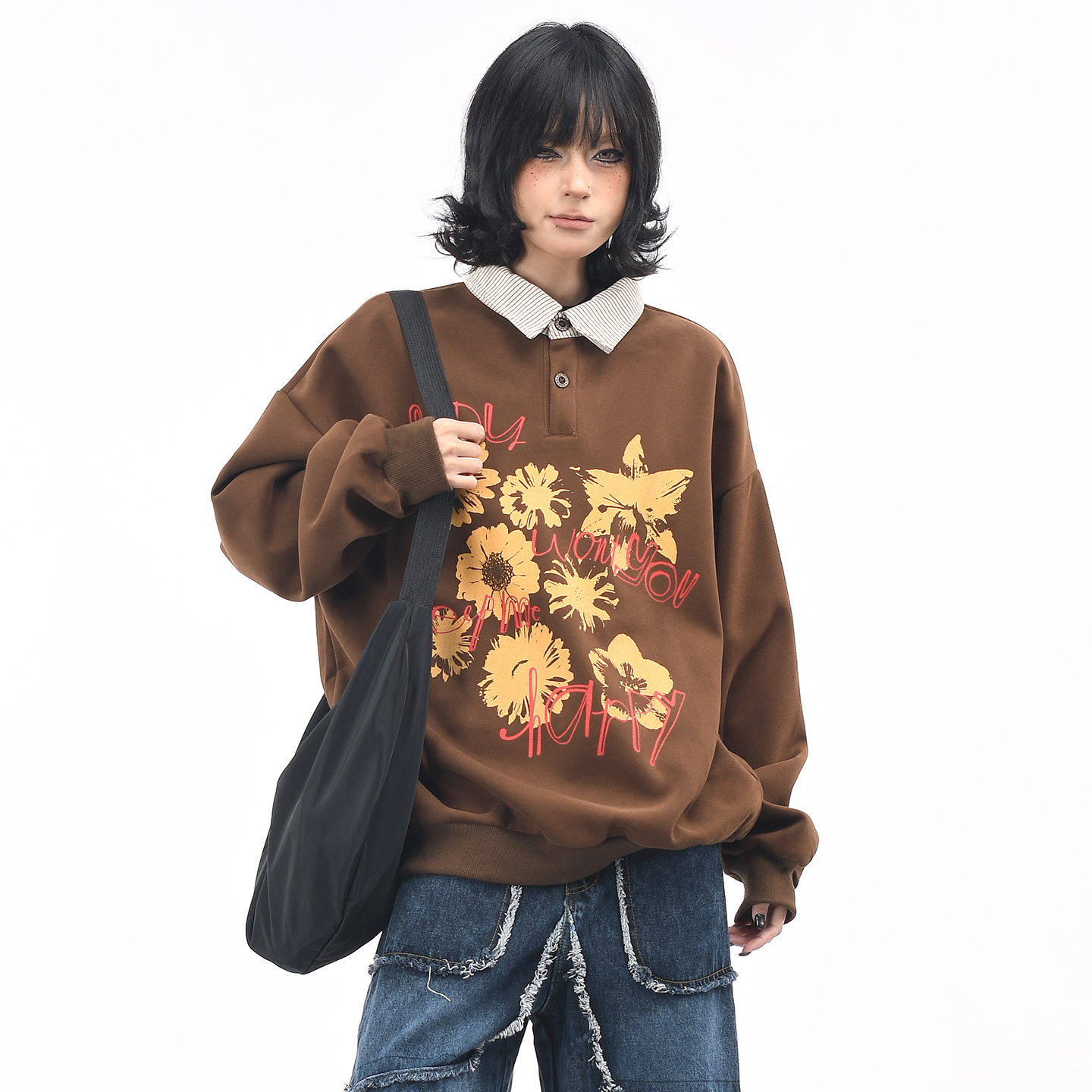 OV原创美式复古花卉印花POLO领卫衣男女秋季宽松撞色拼接休闲上衣