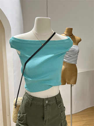 甜辣一字肩上衣女夏露肩锁骨新款别致chic韩系修身短款条纹针织衫
