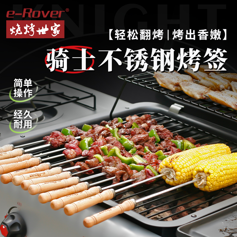 烧烤签子不锈钢 羊肉串烤肉串用具铁签子木柄烤针全套扁钎子家用