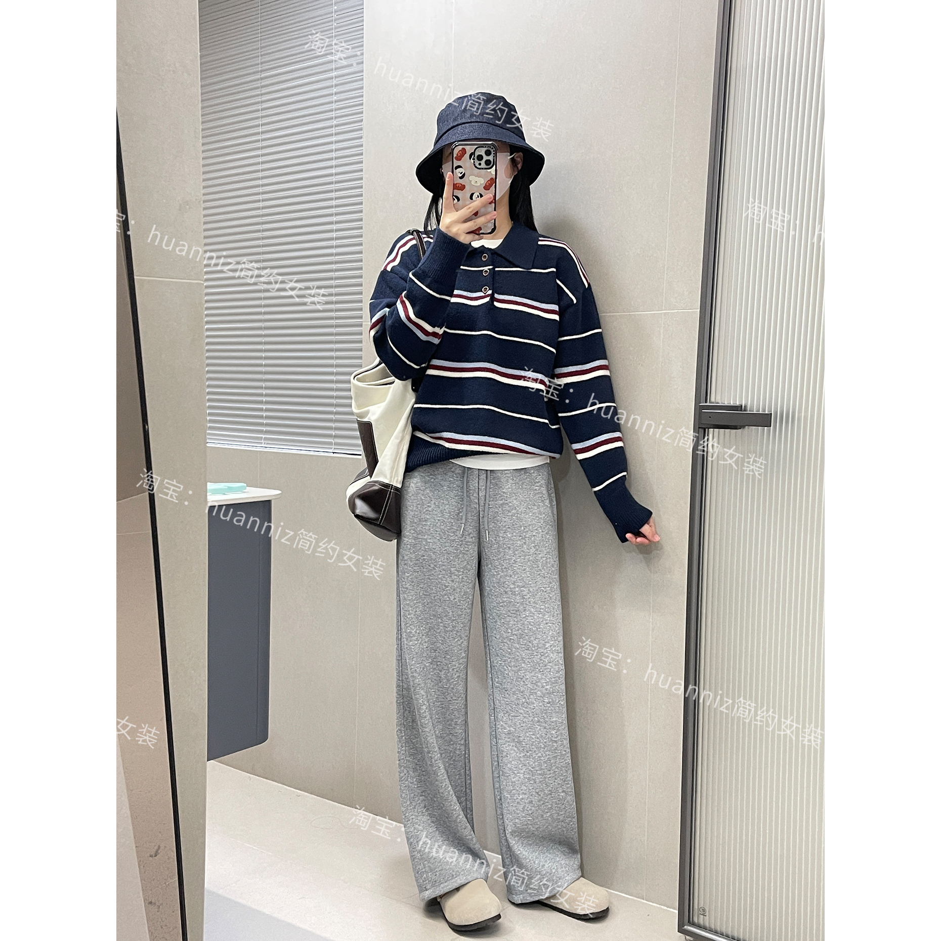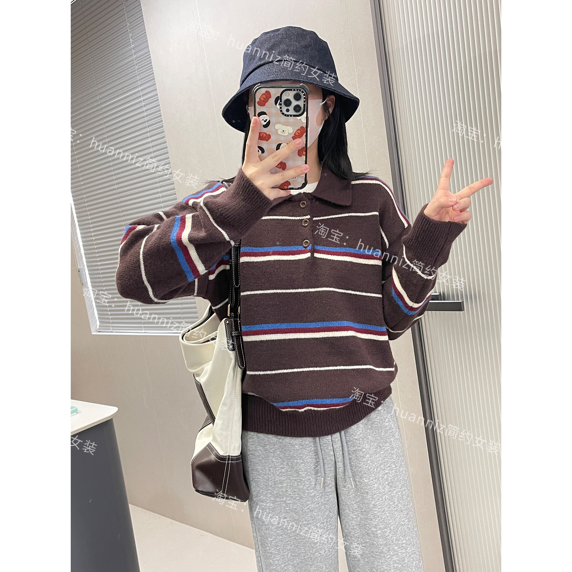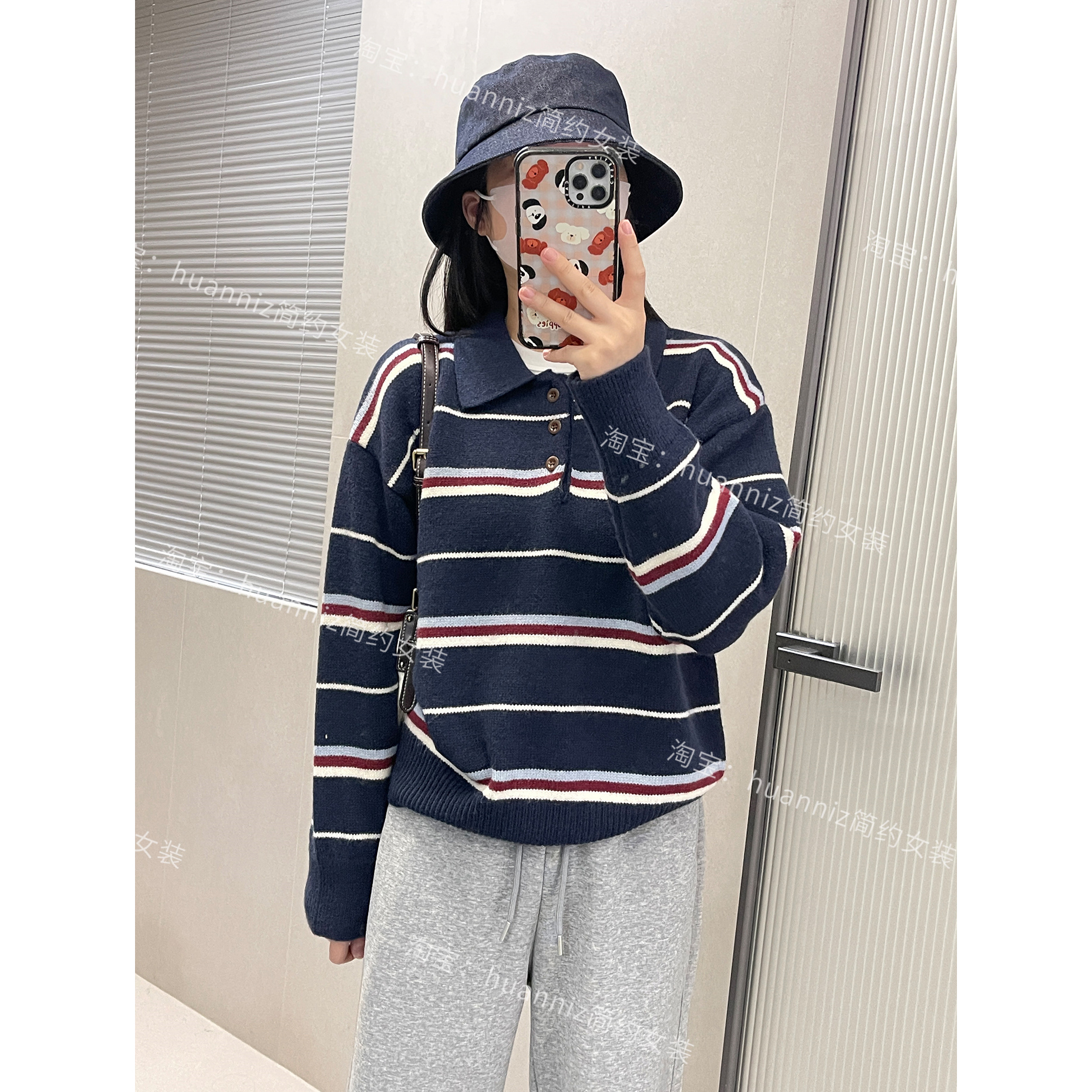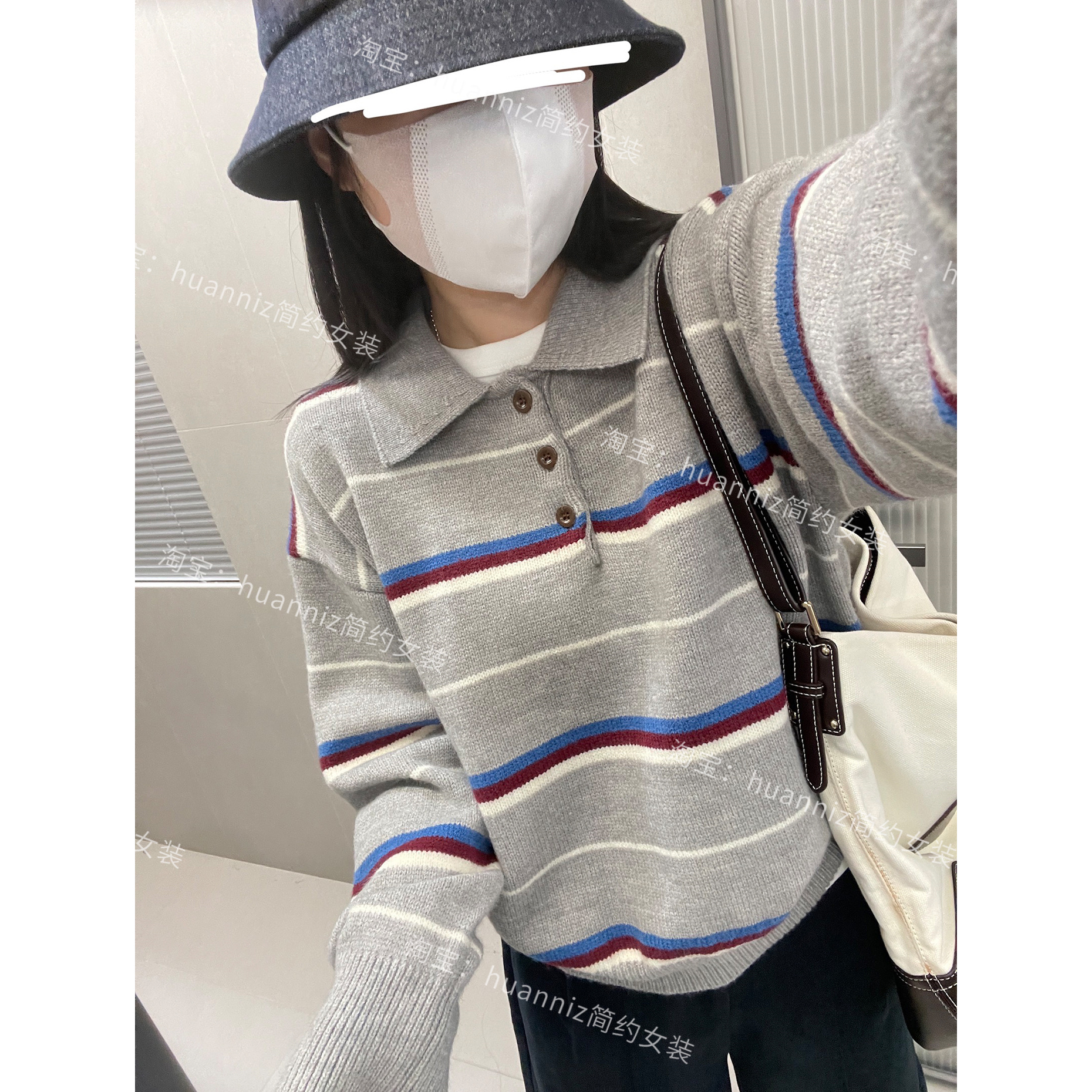 polo翻领三粒扣复古撞色条纹毛衣秋冬厚实保暖柔软套头针织衫外套