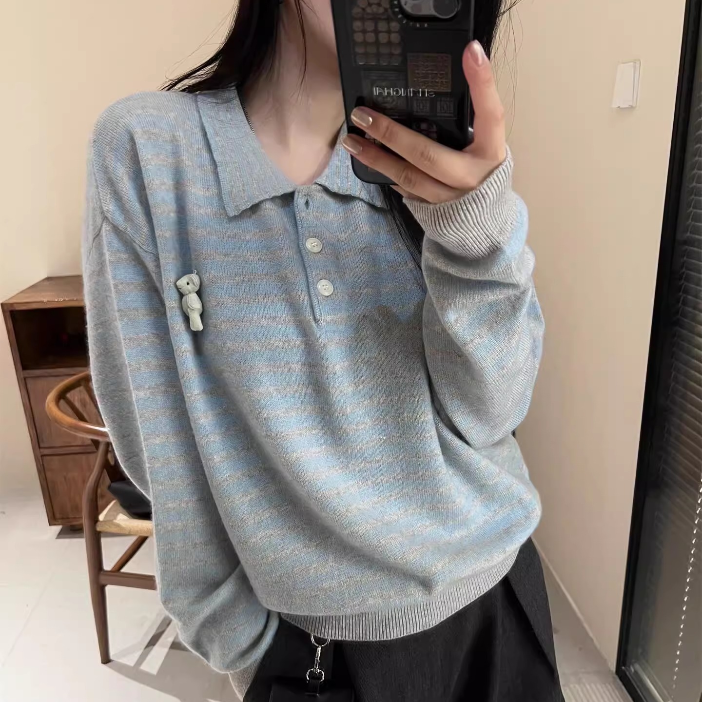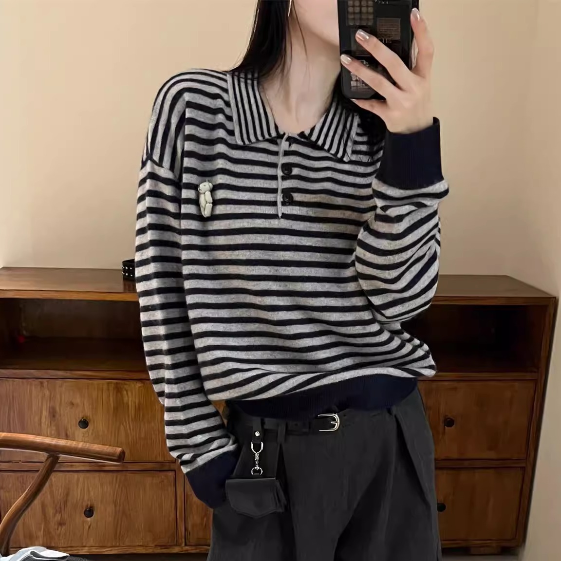 小熊挂件 时髦条纹控 POLO翻领套头羊毛毛衣 休闲宽松针织女上衣