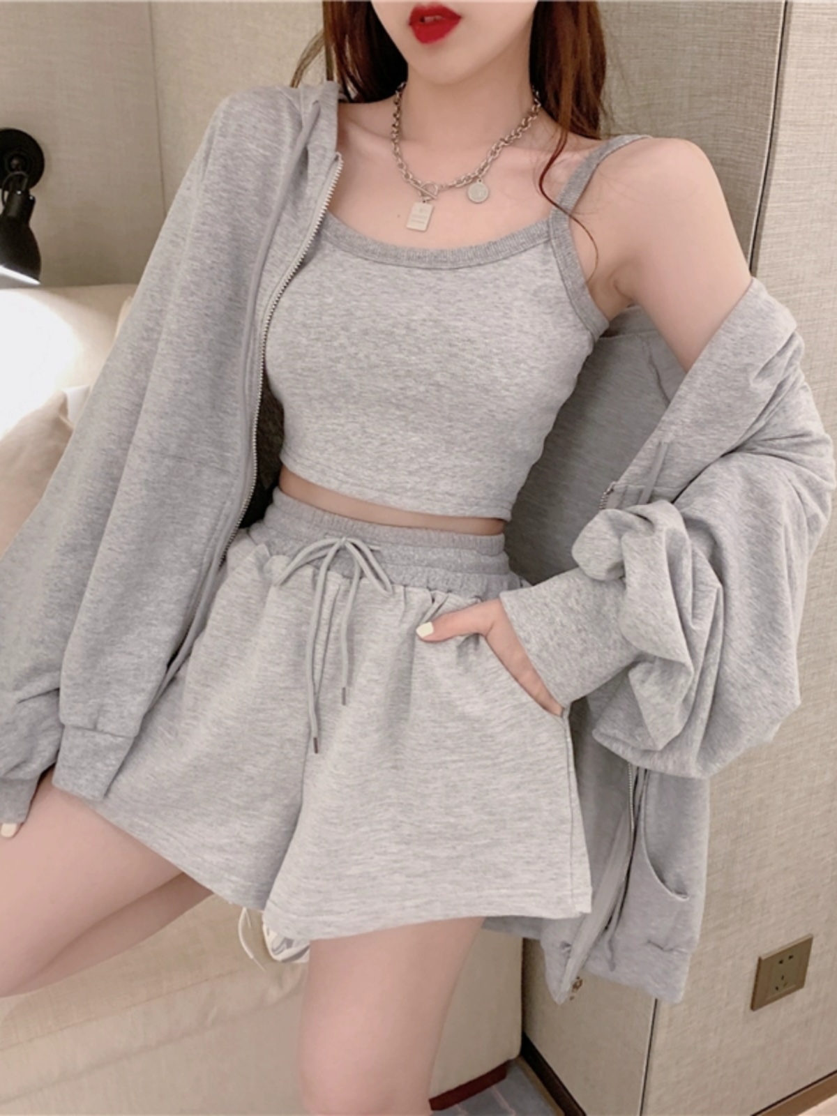 运动风吊带背心休闲服套装女爆款宽松韩版显瘦外套短裤学生三件套