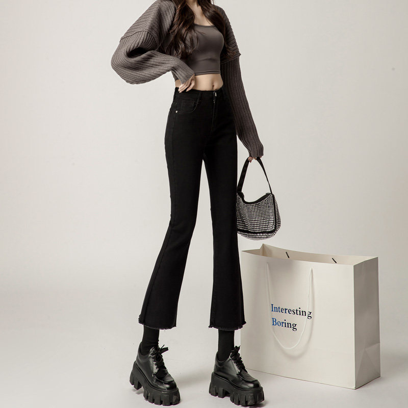 黑色微喇叭牛仔裤女九分裤春秋爆款高腰弹力显瘦毛边八分小个子