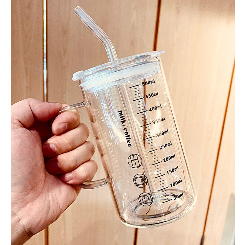 吸管杯玻璃杯大容量1000ml带刻度把手耐高温水杯男生办公室茶杯子