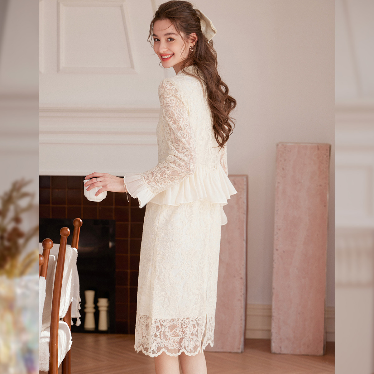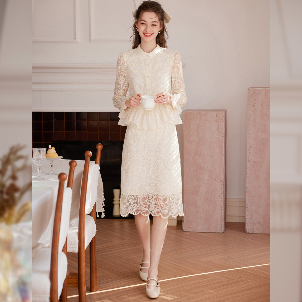 白鹿语绣花蕾丝假两件连衣裙2025秋新款立领纯欲仙女风礼服名媛风