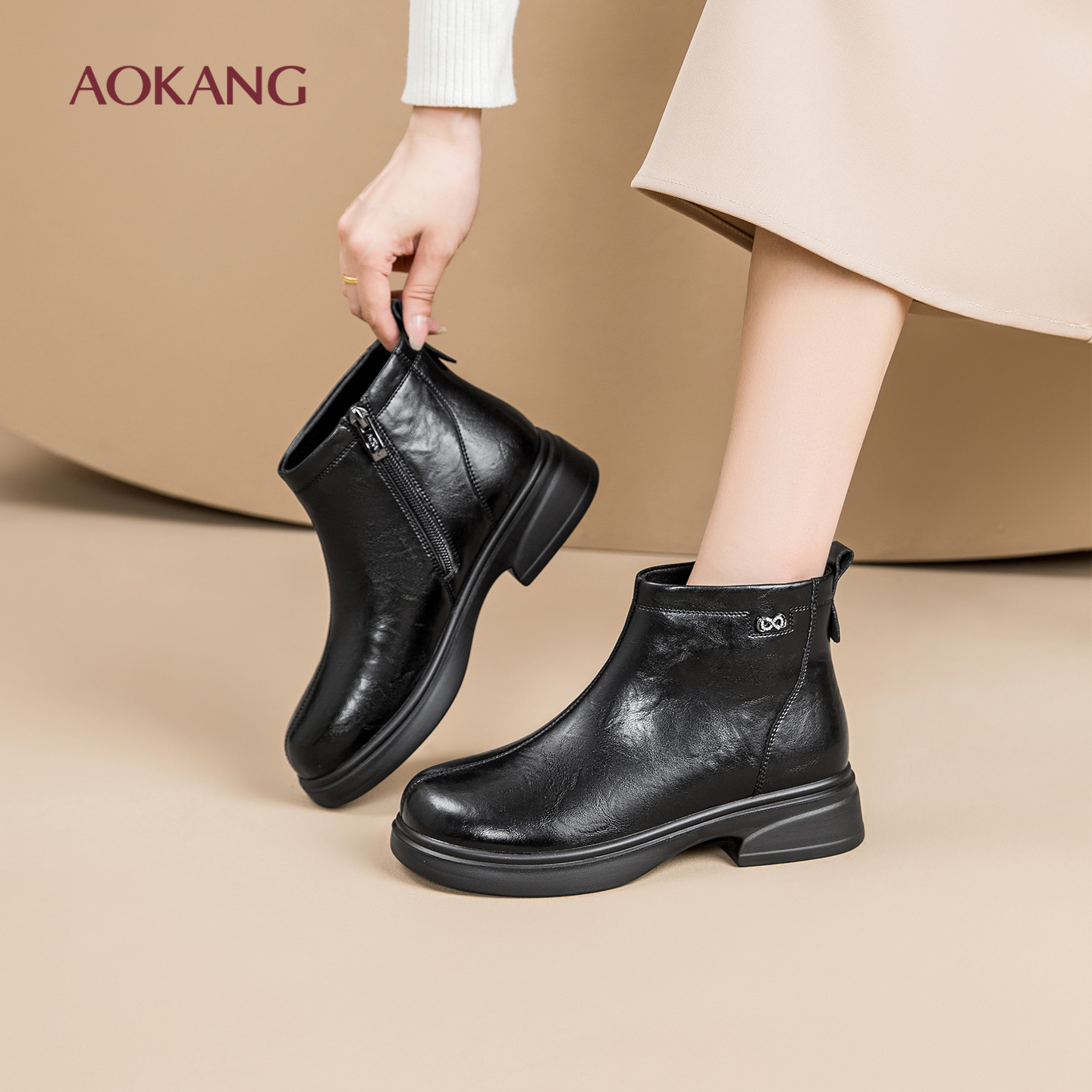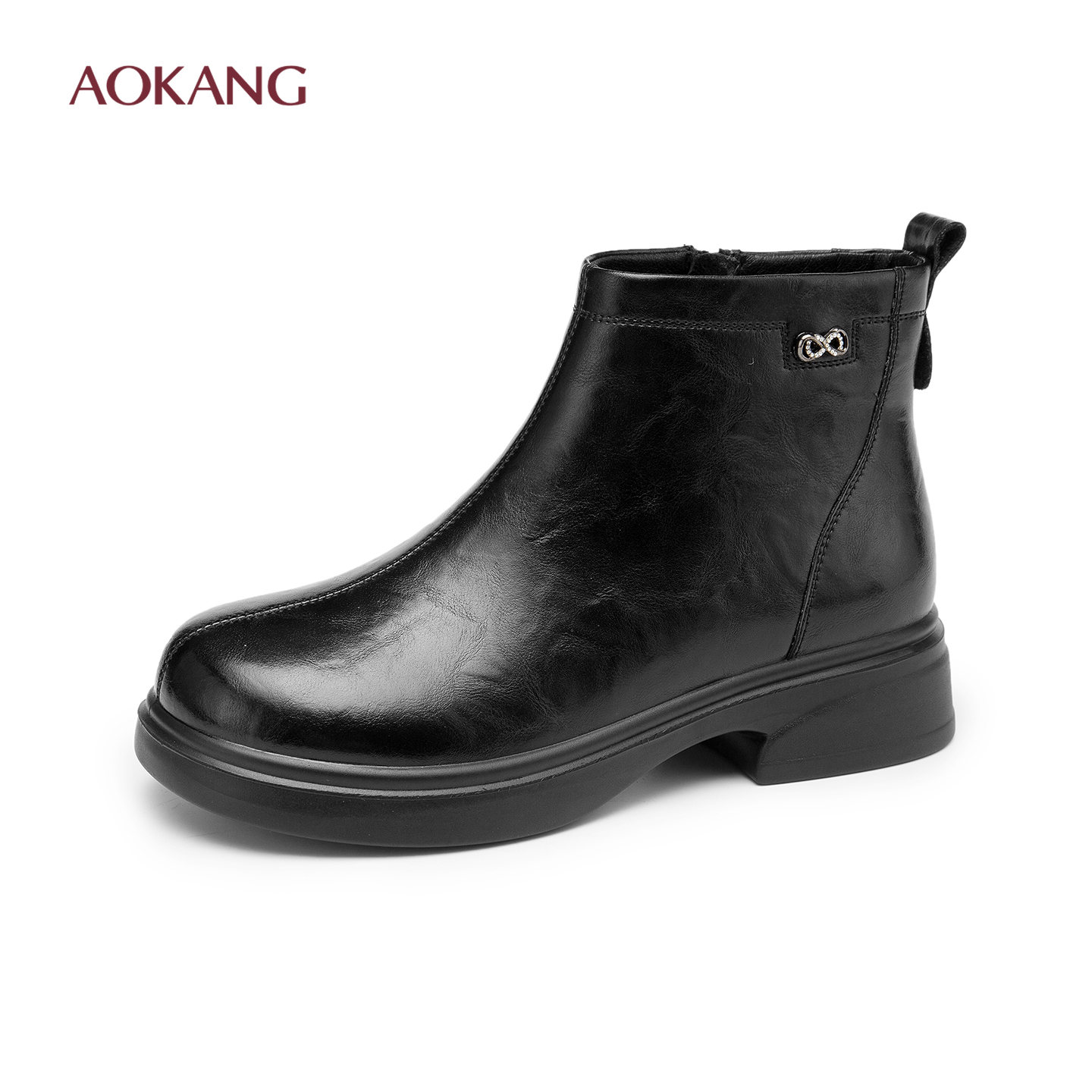 奥康 女鞋2025冬季新款加绒短靴女保暖粗跟靴子真皮短筒靴N