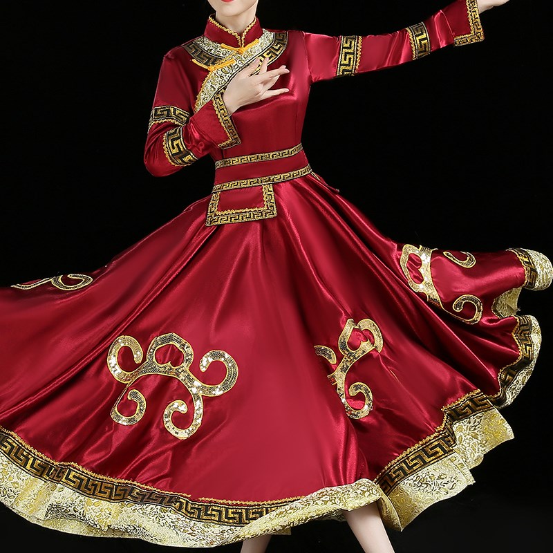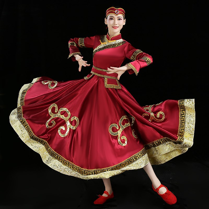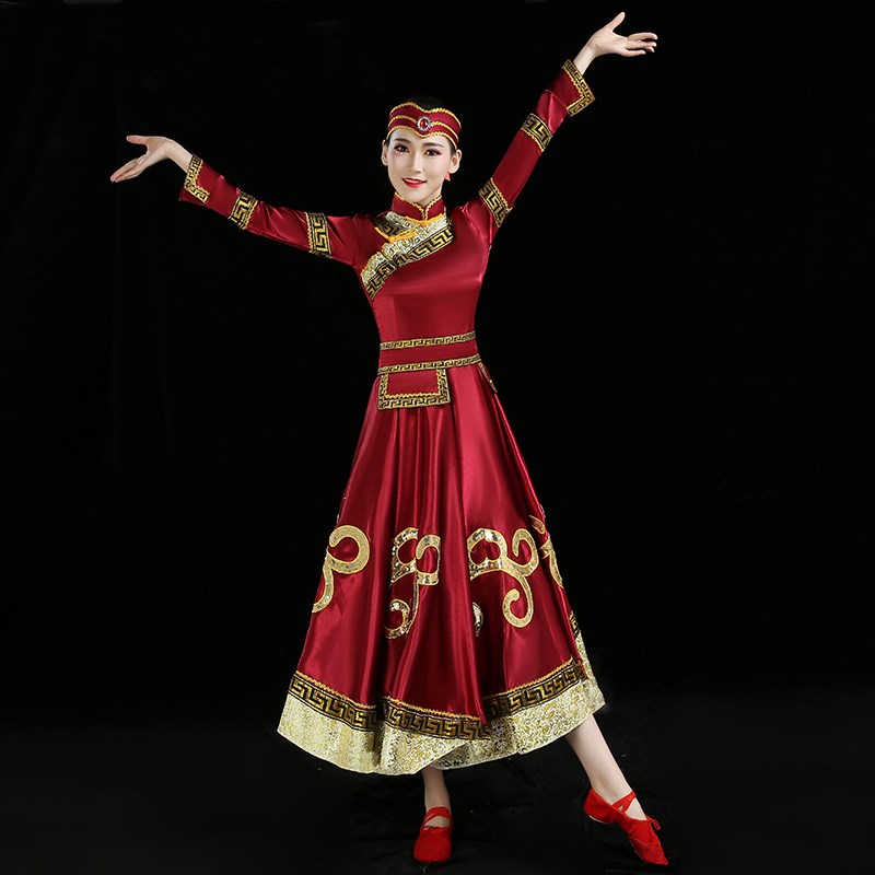 现货速发新款蒙古舞蹈演出服成人蒙族酒红色舞台表演服大摆长裙少