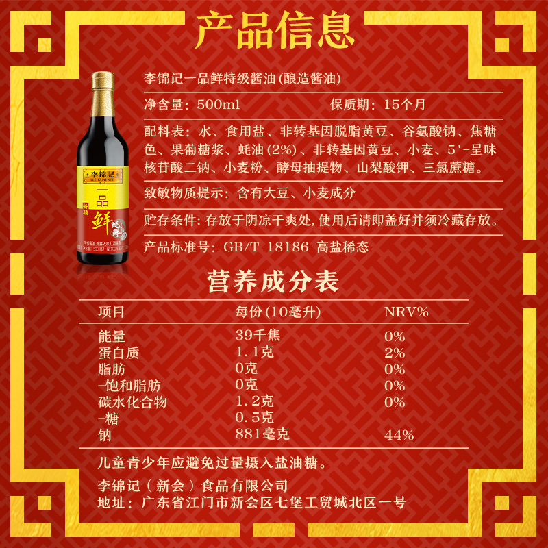 李锦记一品鲜特级酱油500ml炒菜点蘸酿造酱油炖肉上色红烧酱油
