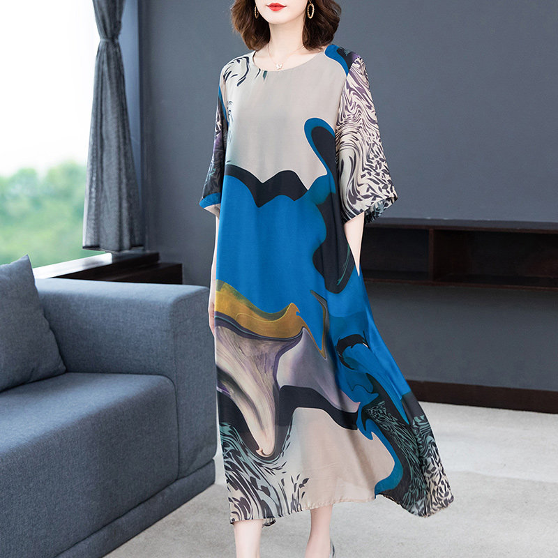 复古文艺大摆长裙女2025夏季印花中长款气质显瘦不规则天丝连衣裙