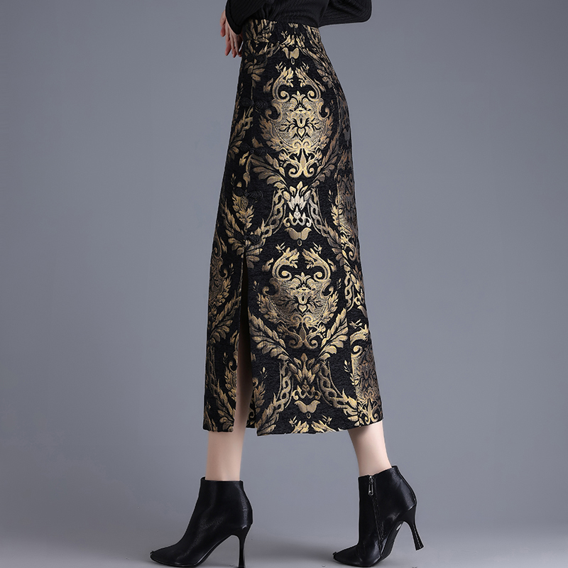烫金印花包臀半身裙女春秋2025新款高腰修身直筒裙中长开叉一步裙