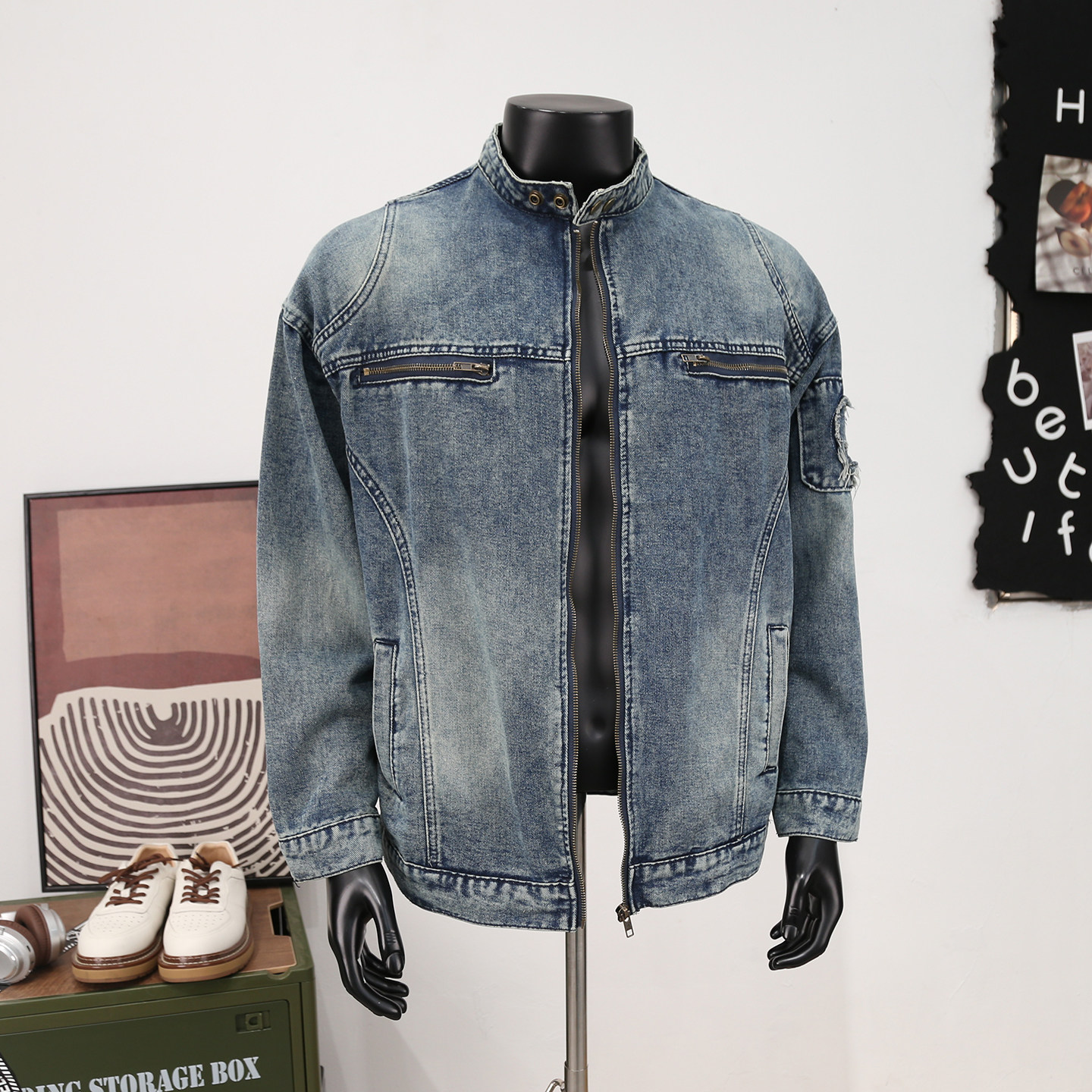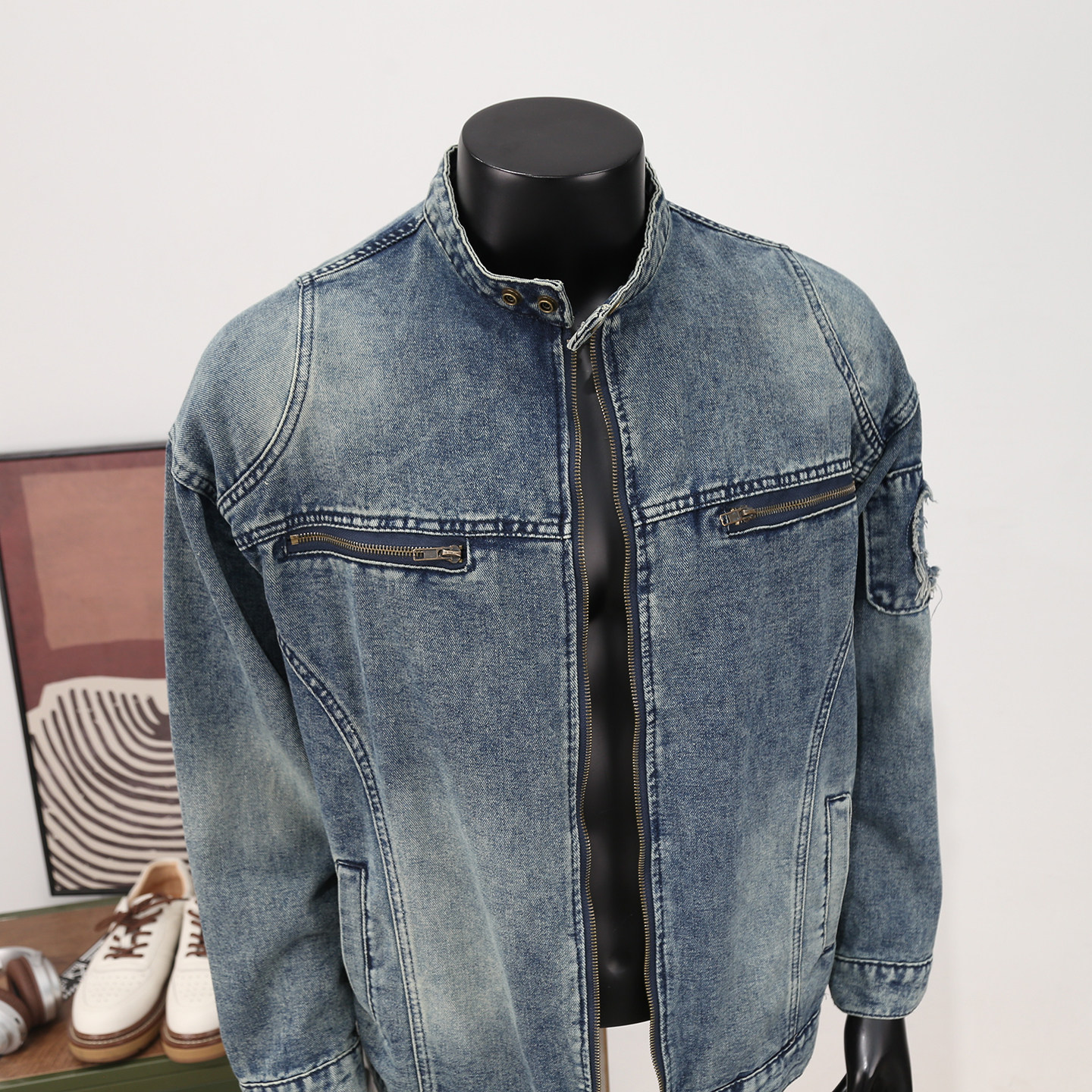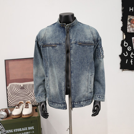 复古贴布拉链痞帅圆领牛仔夹克男高街潮牌洗水休闲工装机车外套秋