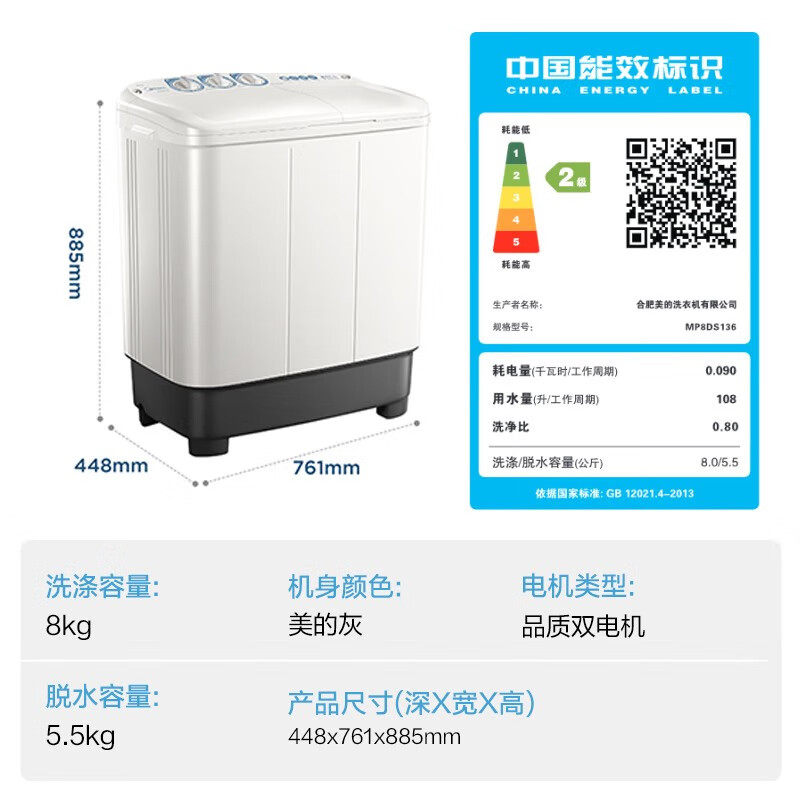 美的8kg脱水5.5kg双筒双缸洗衣机