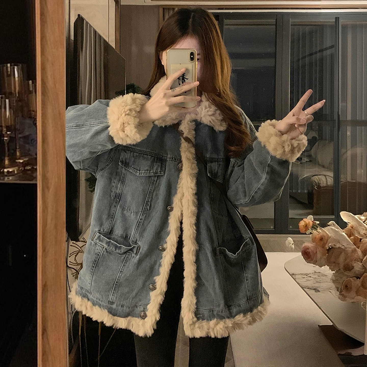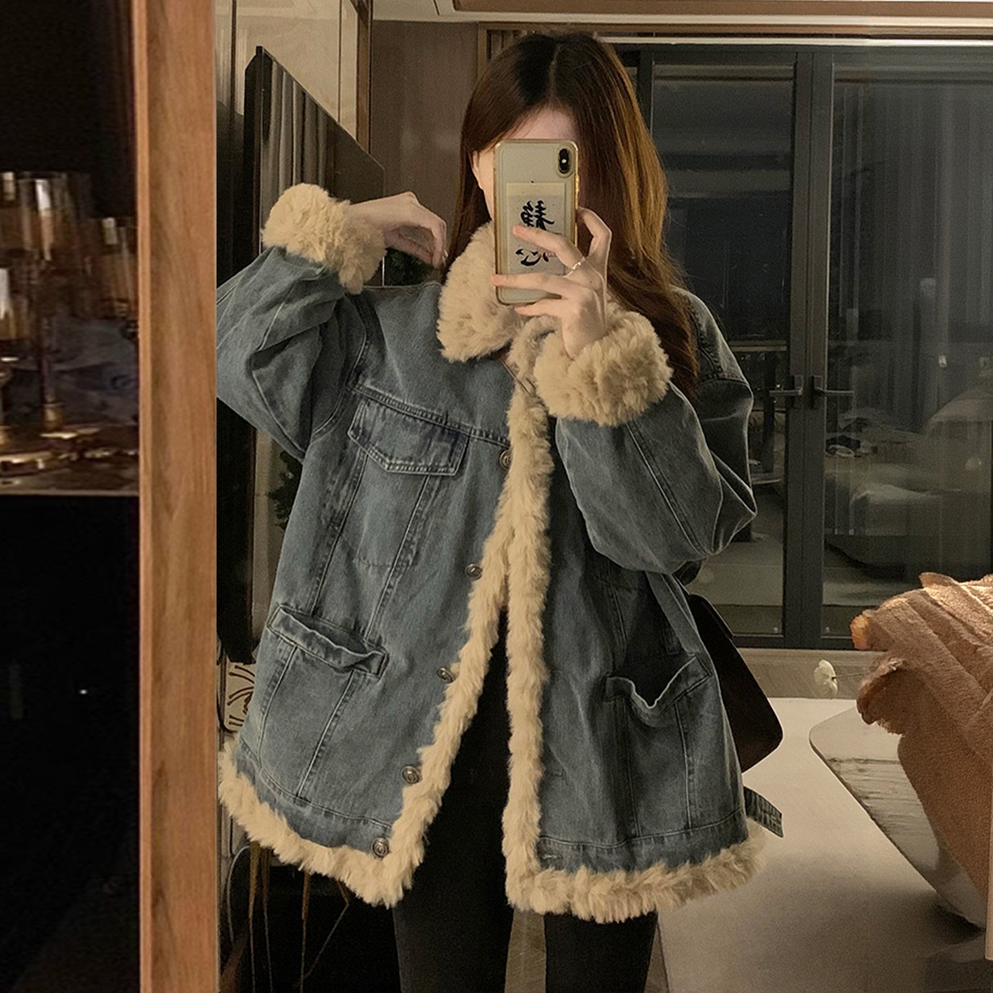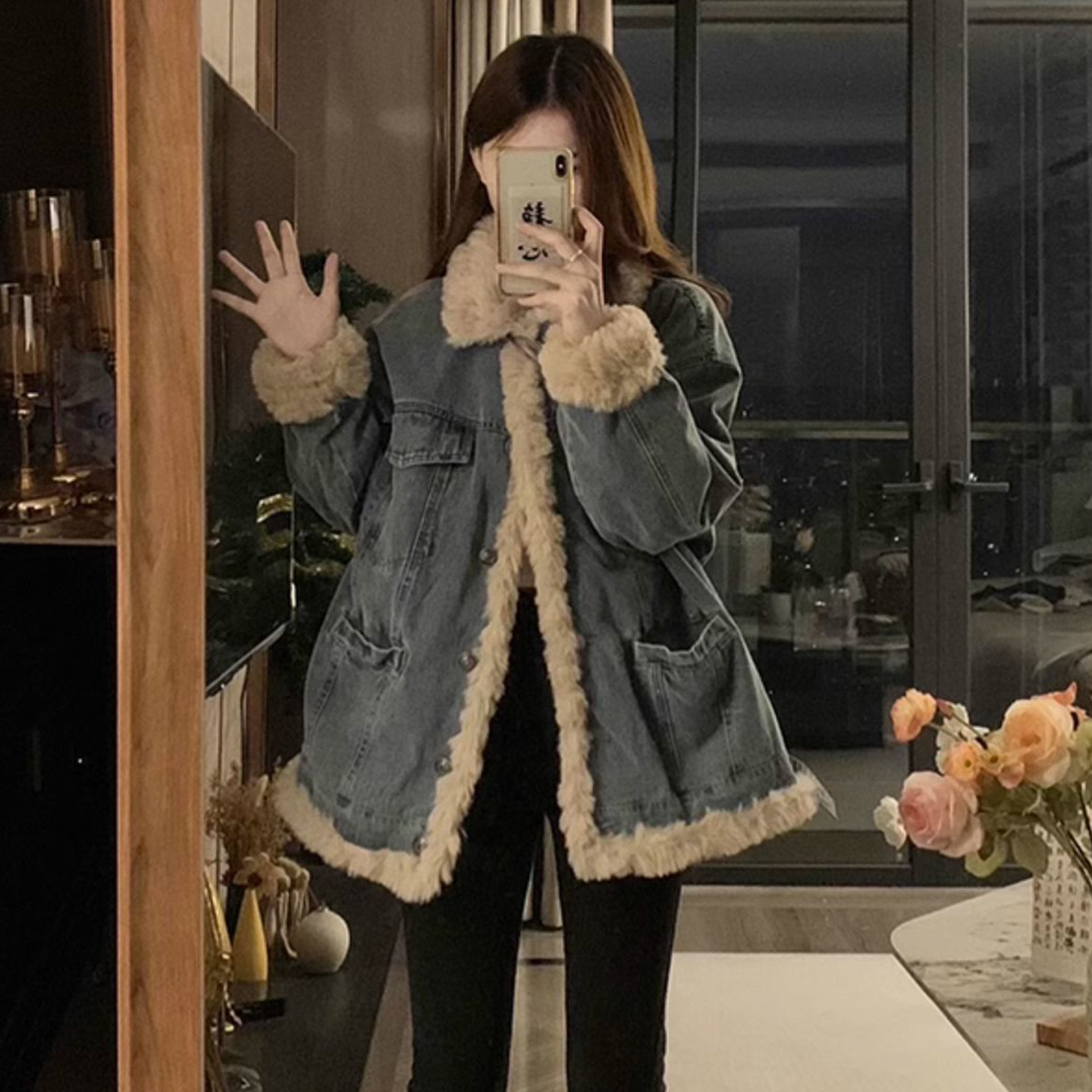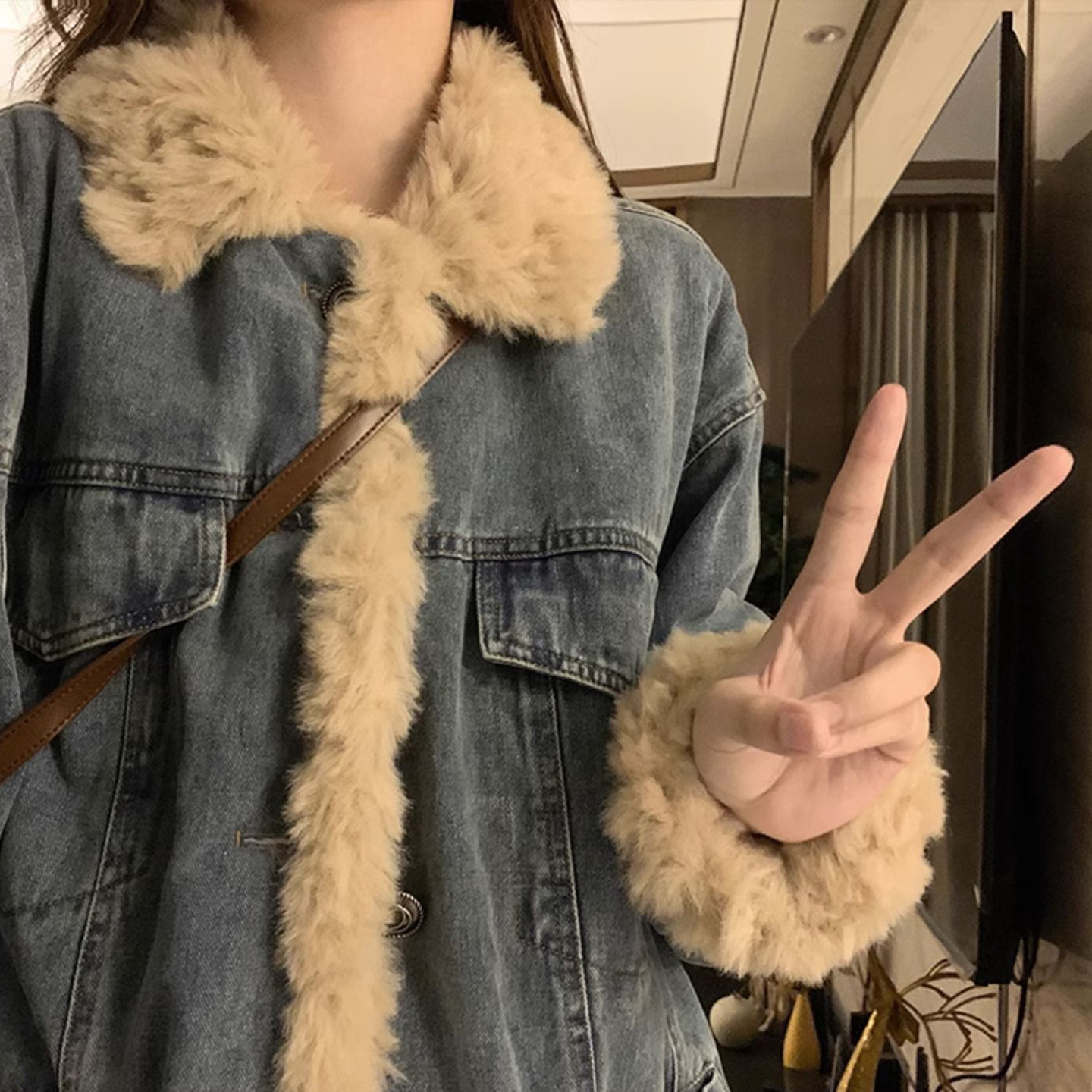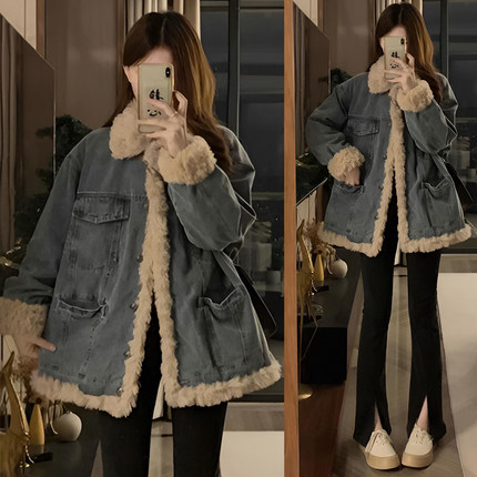 胖mm特大码宽松加厚保暖牛仔外套女韩系简约高级感羊羔毛棉服上衣