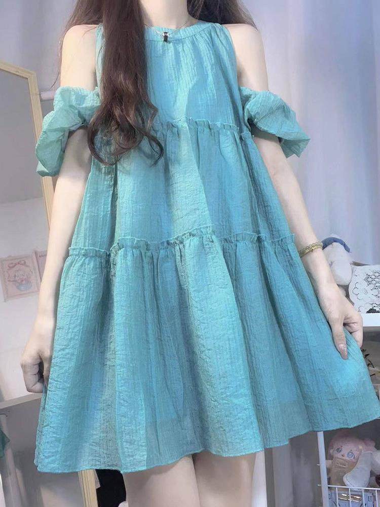 夏季日系软妹气质可爱露肩泡泡袖圆领挂脖连衣裙女学生新款蛋糕裙