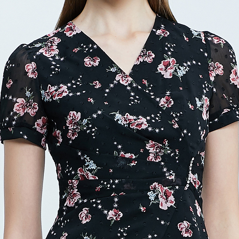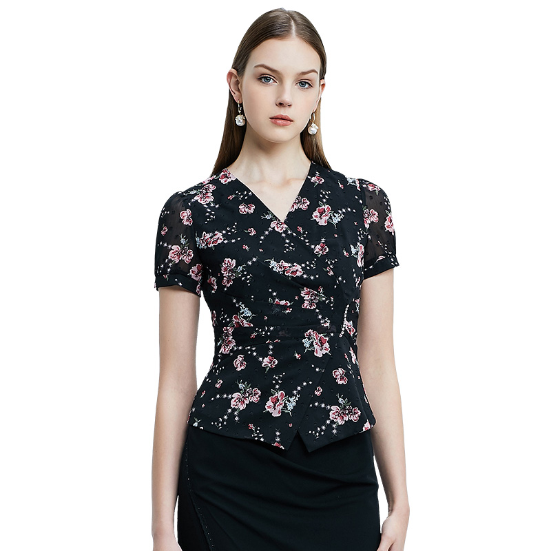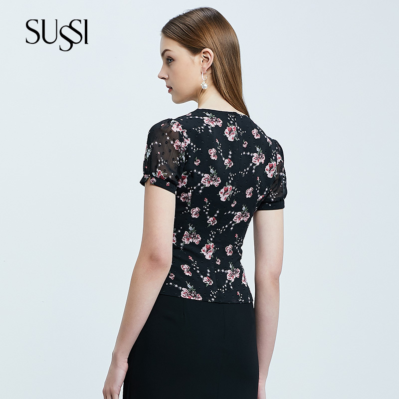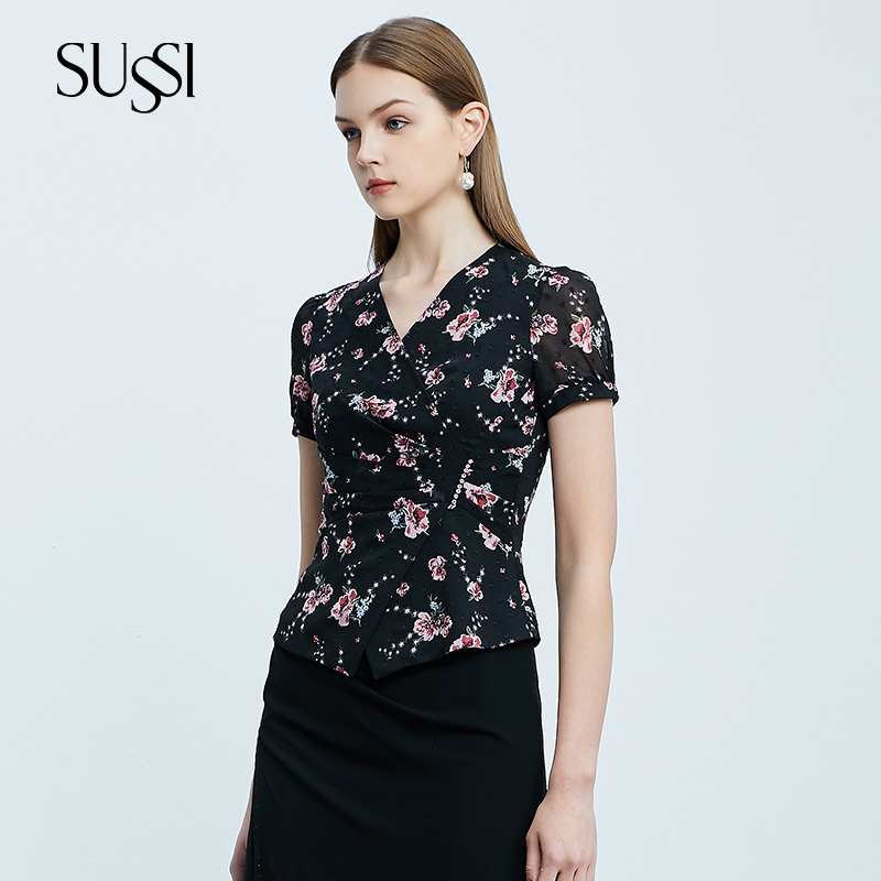 SUSSI古色夏季新品黑色通勤印花雪纺短袖衬衫上衣女