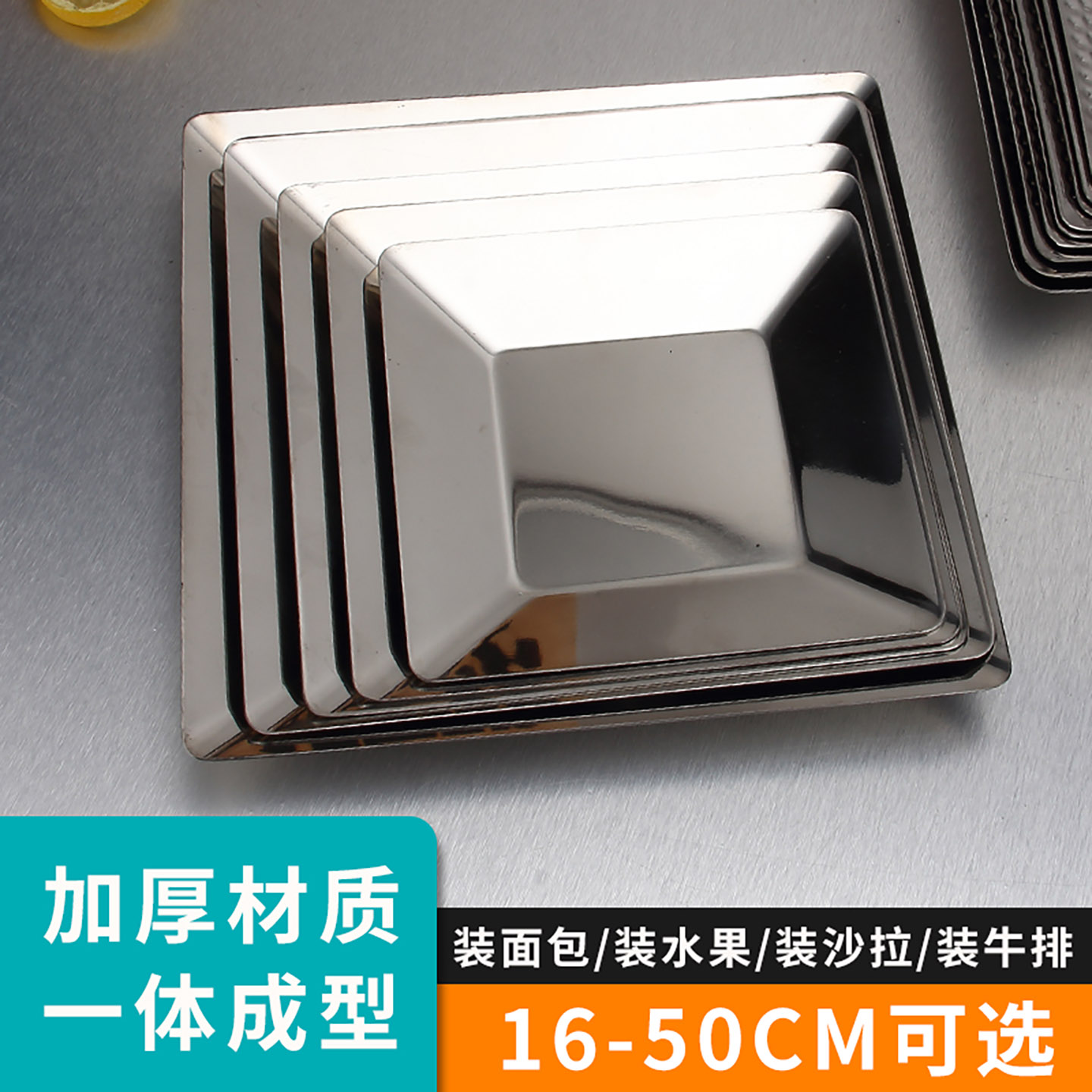 不锈钢方盘四方牛排盘子平底西餐盘加厚正方形水果盘碟子商用托盘