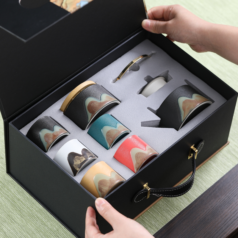 苏氏陶瓷 千里江山釉画彩五色杯提梁壶配茶盘茶叶罐精致功夫茶具