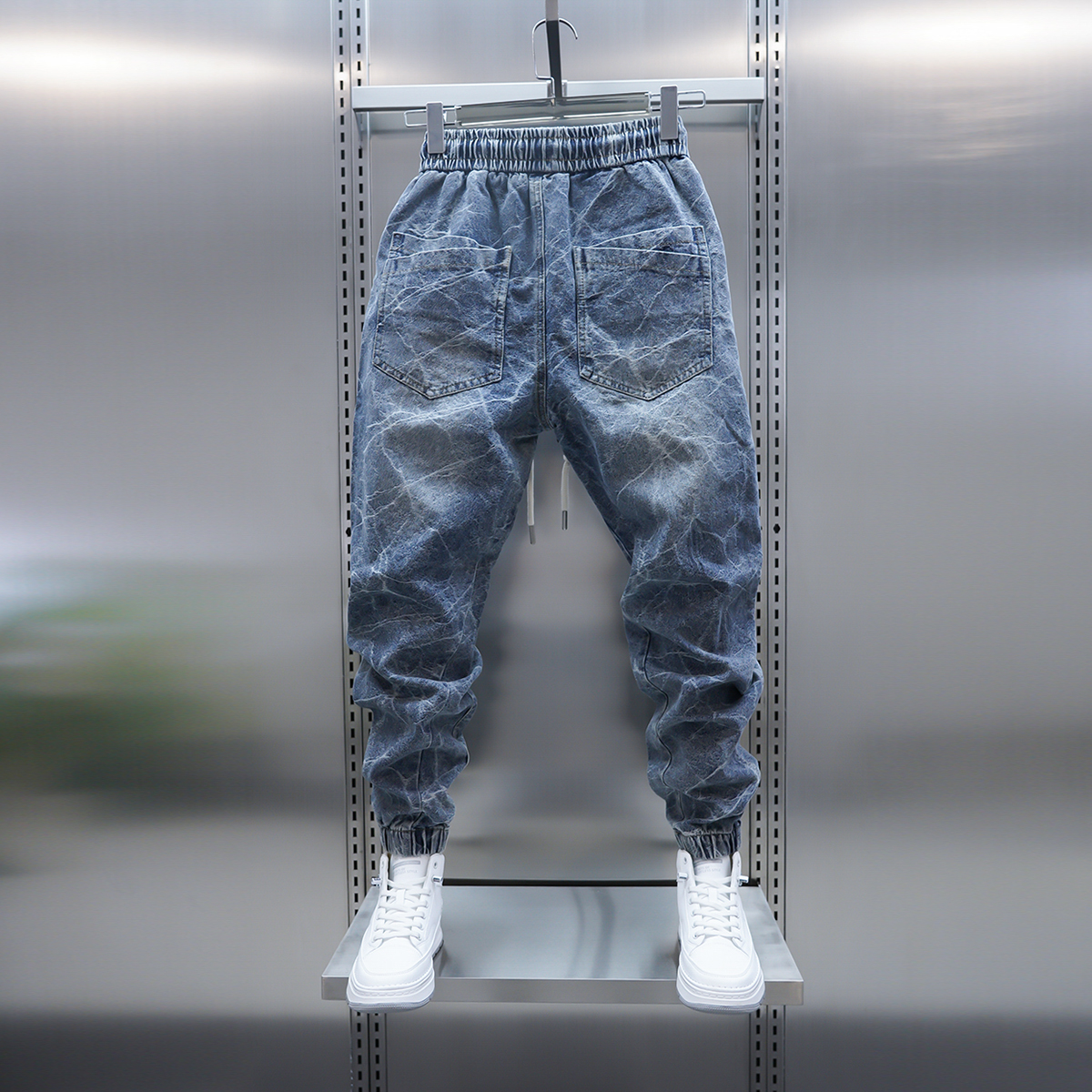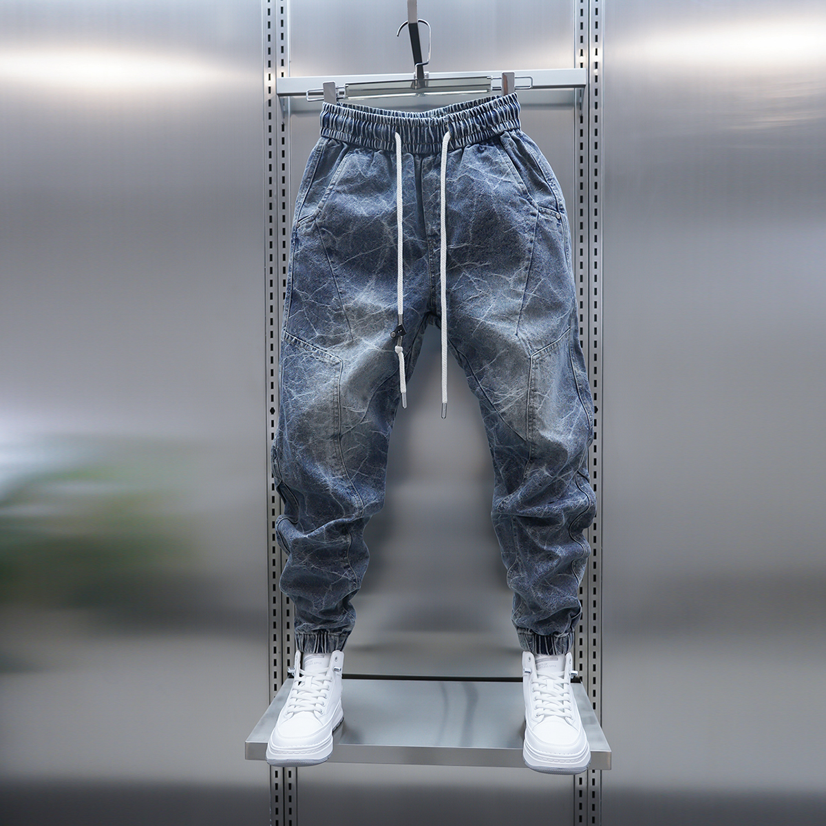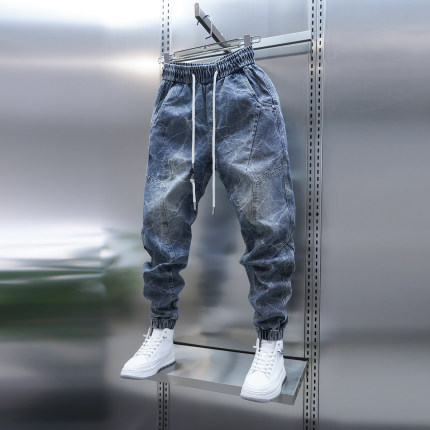 2025男士新款蓝色牛仔裤秋冬季韩版时尚提花工艺束脚裤潮男小脚裤