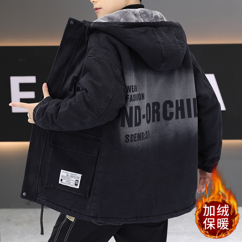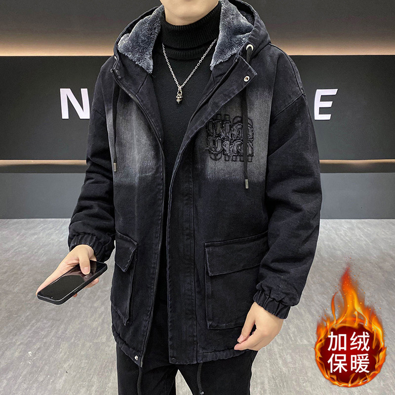 冬季加绒加厚牛仔派克服男中长款棉袄青少年高中学生连帽棉衣外套