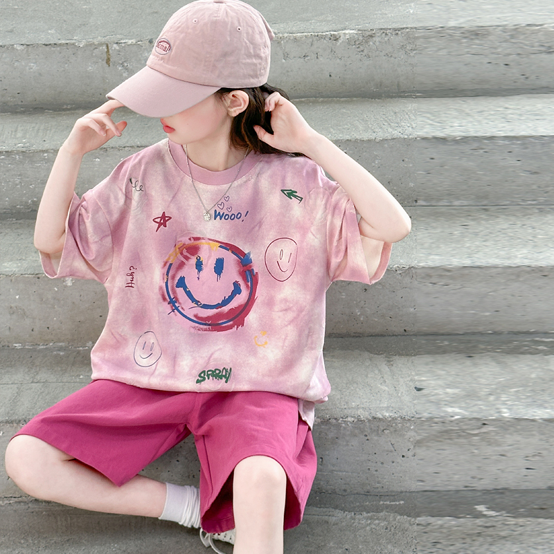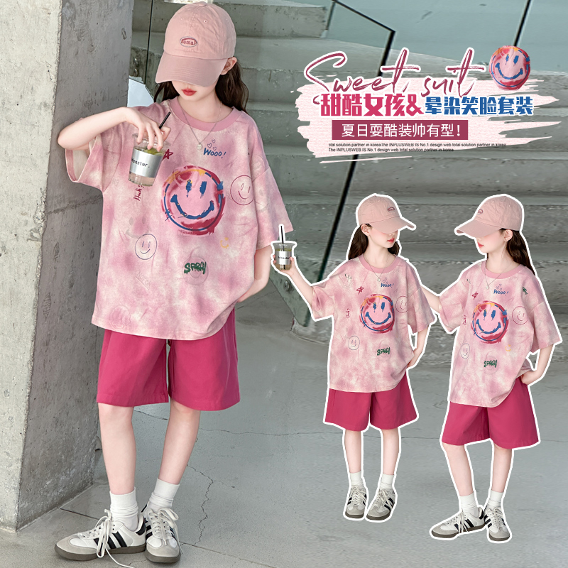 女童夏套装2025新款夏装女孩网红卡通笑脸大版短袖Tt恤儿童两件套