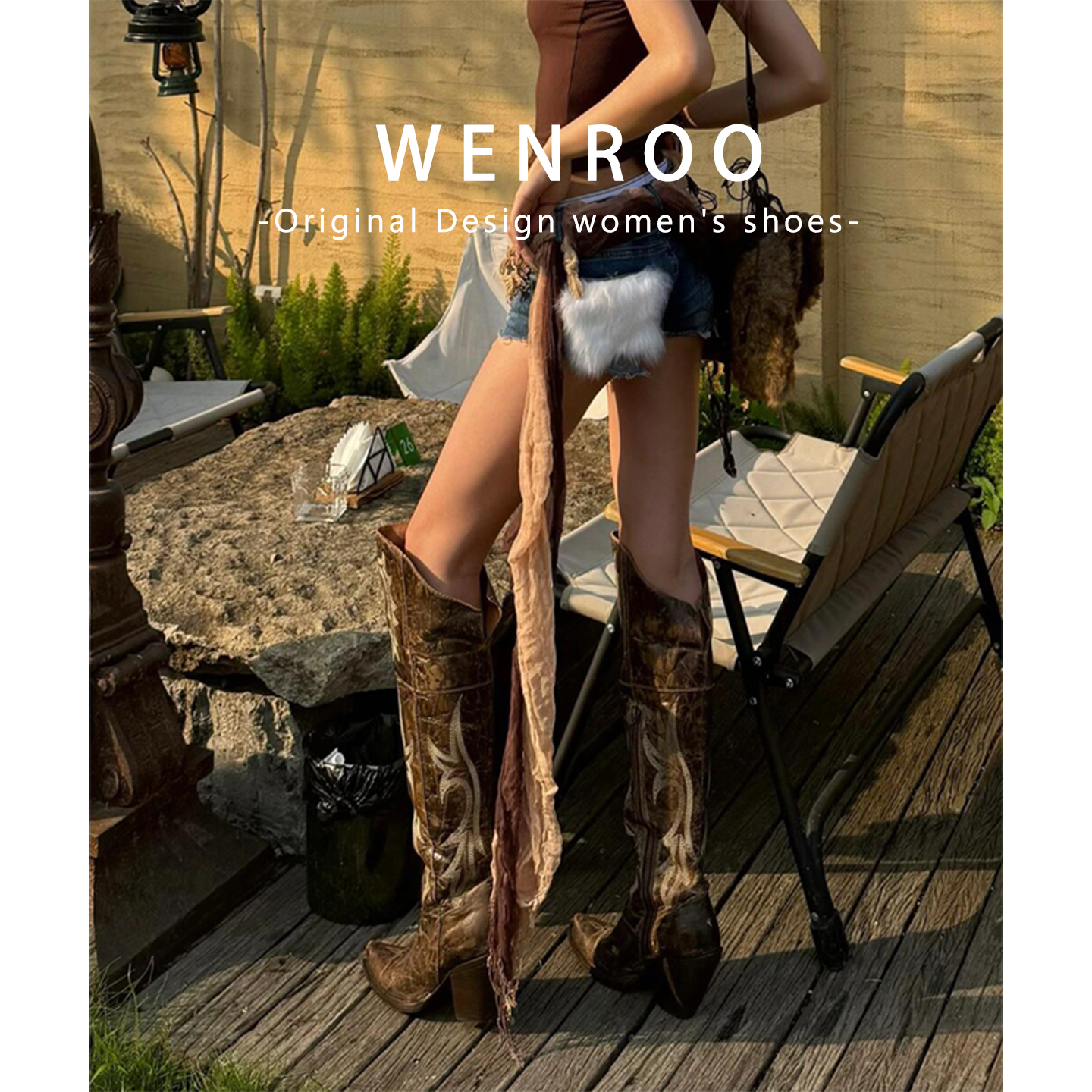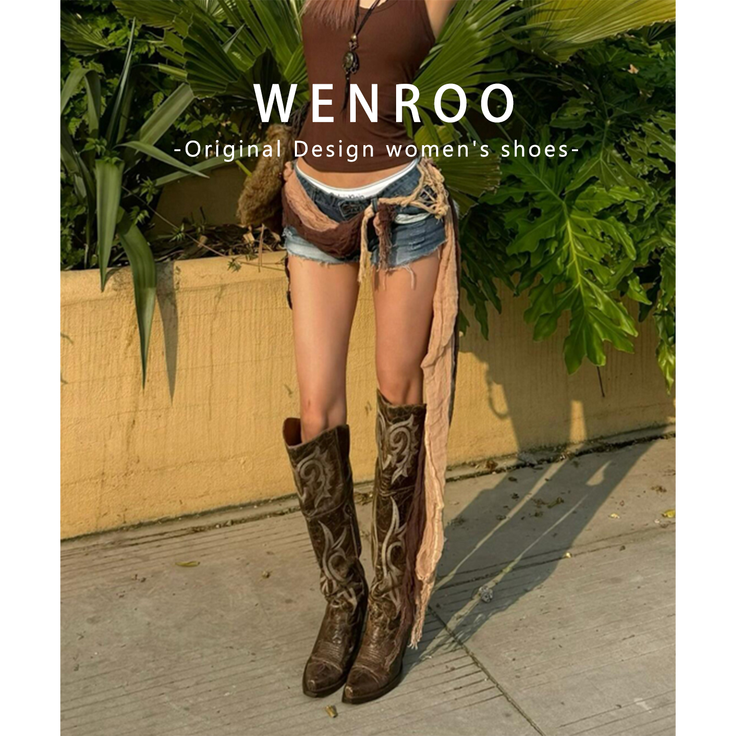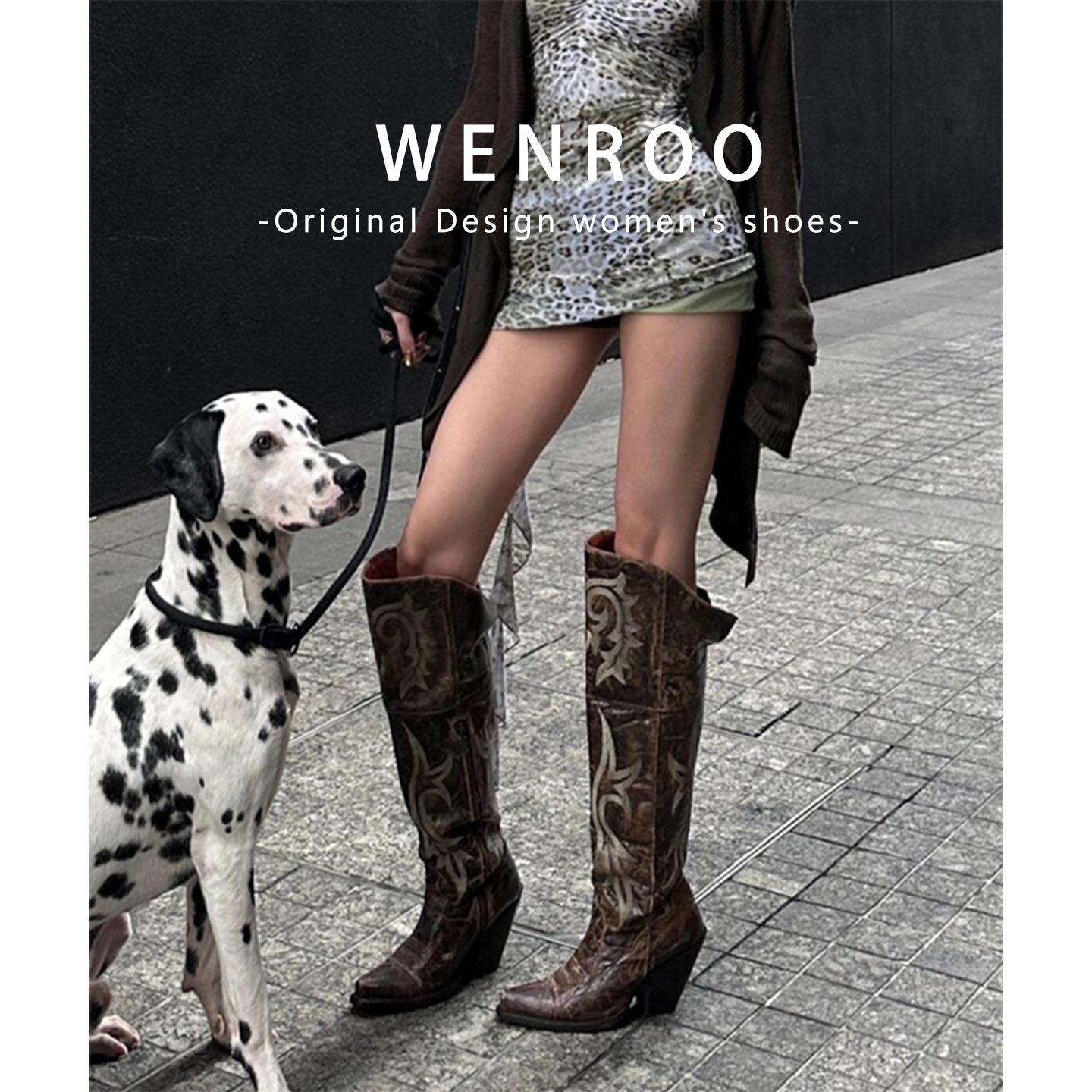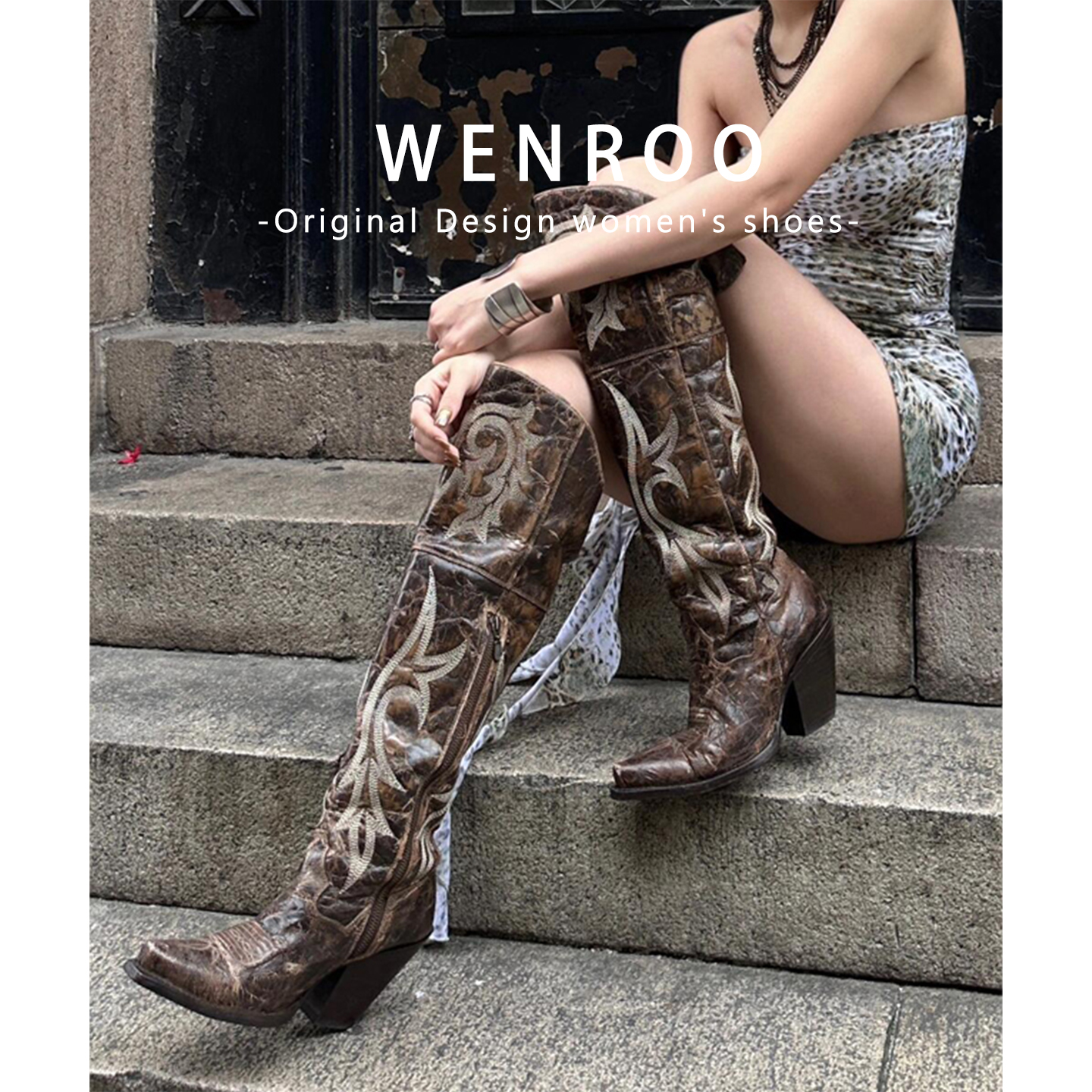 棕色复古刺绣西部牛仔靴女粗跟2025秋冬美拉德过膝高筒骑士长靴子