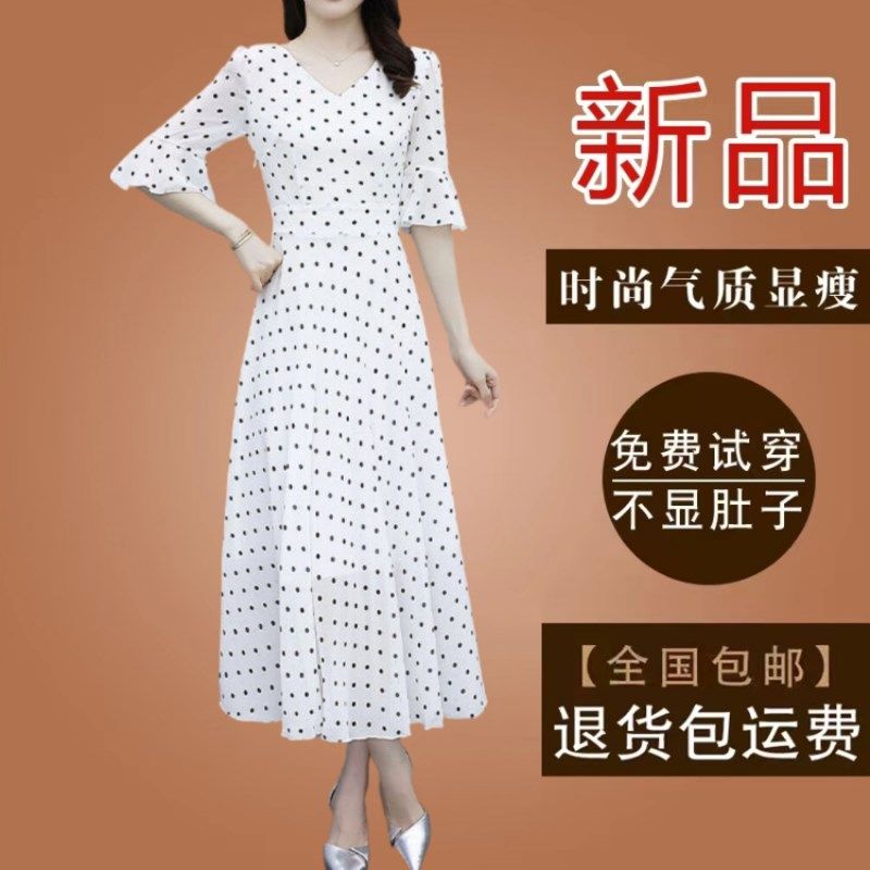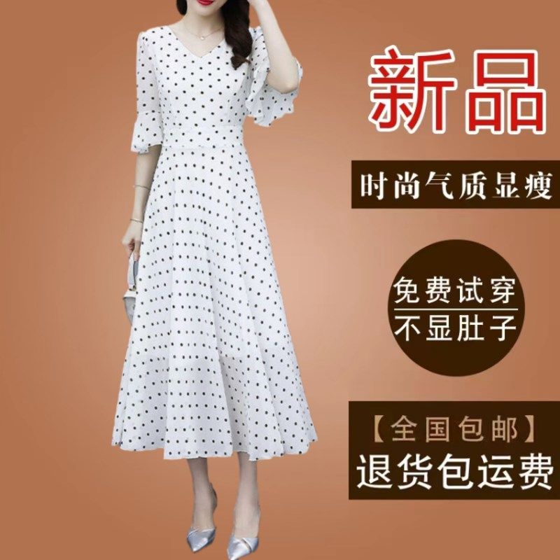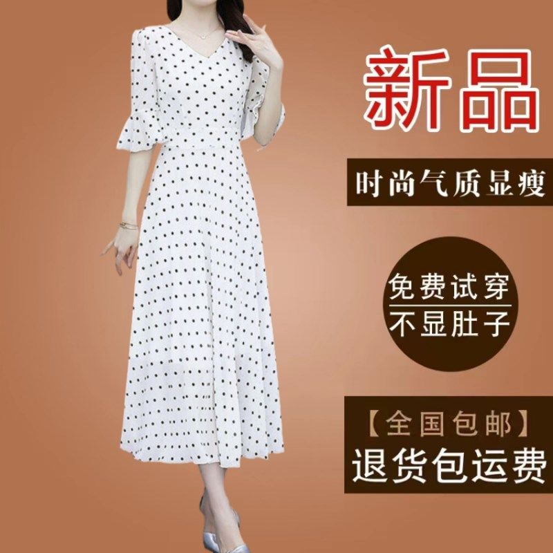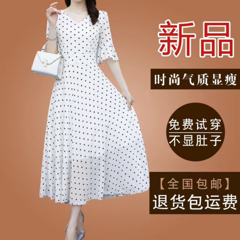 高档妈妈款白色波点碎花真丝雪纺连衣裙2025夏季短袖遮肚显瘦长裙