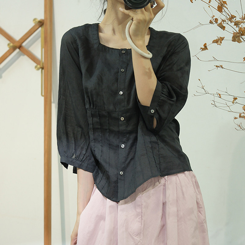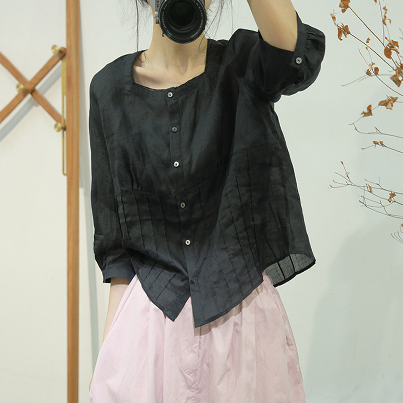 古与色夏季文艺复古拼接褶皱方领宽松大码衬衣蝙蝠中袖苎麻衬衫女