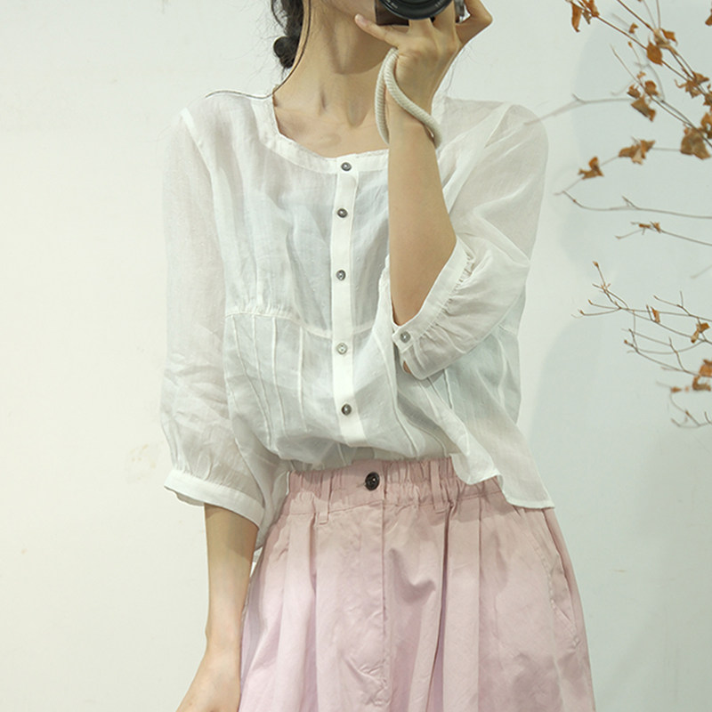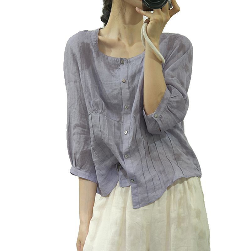 宽松文艺中袖苎麻褶皱衬衫夏季女