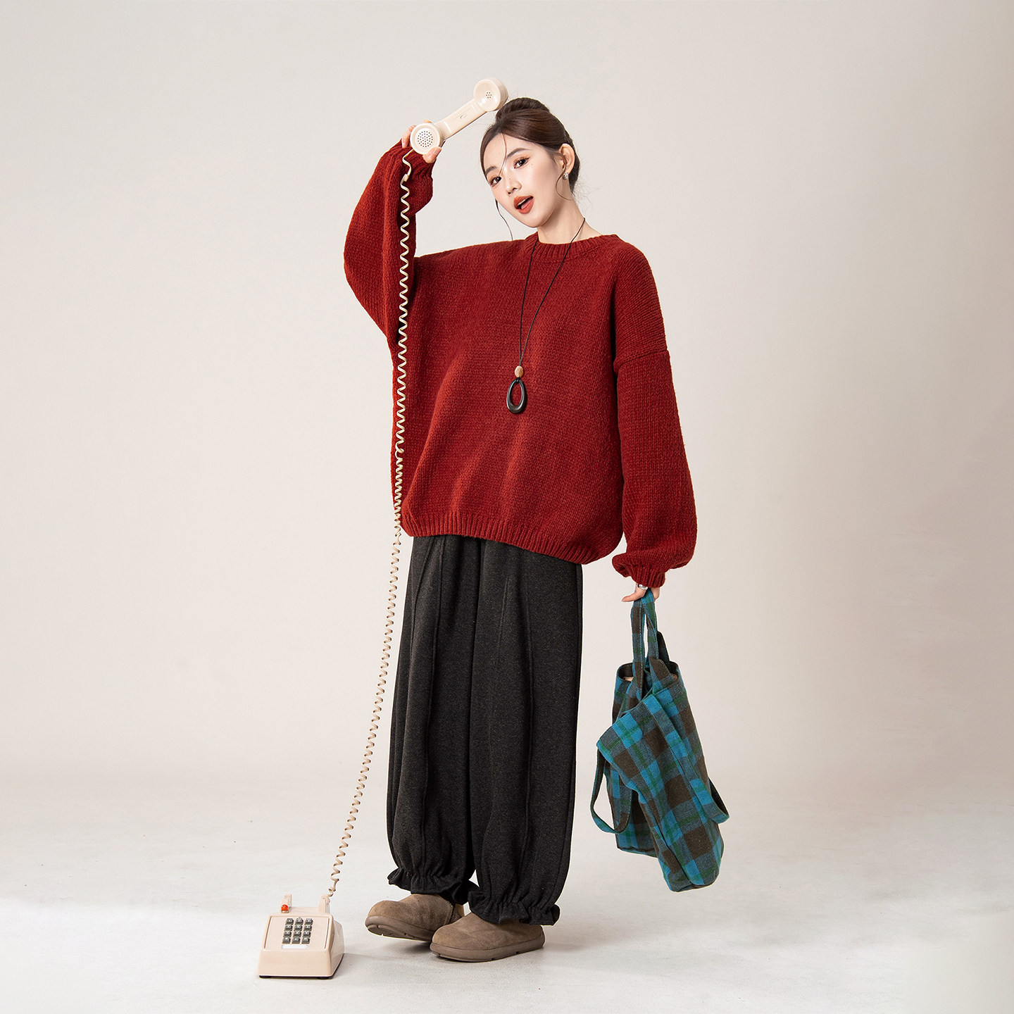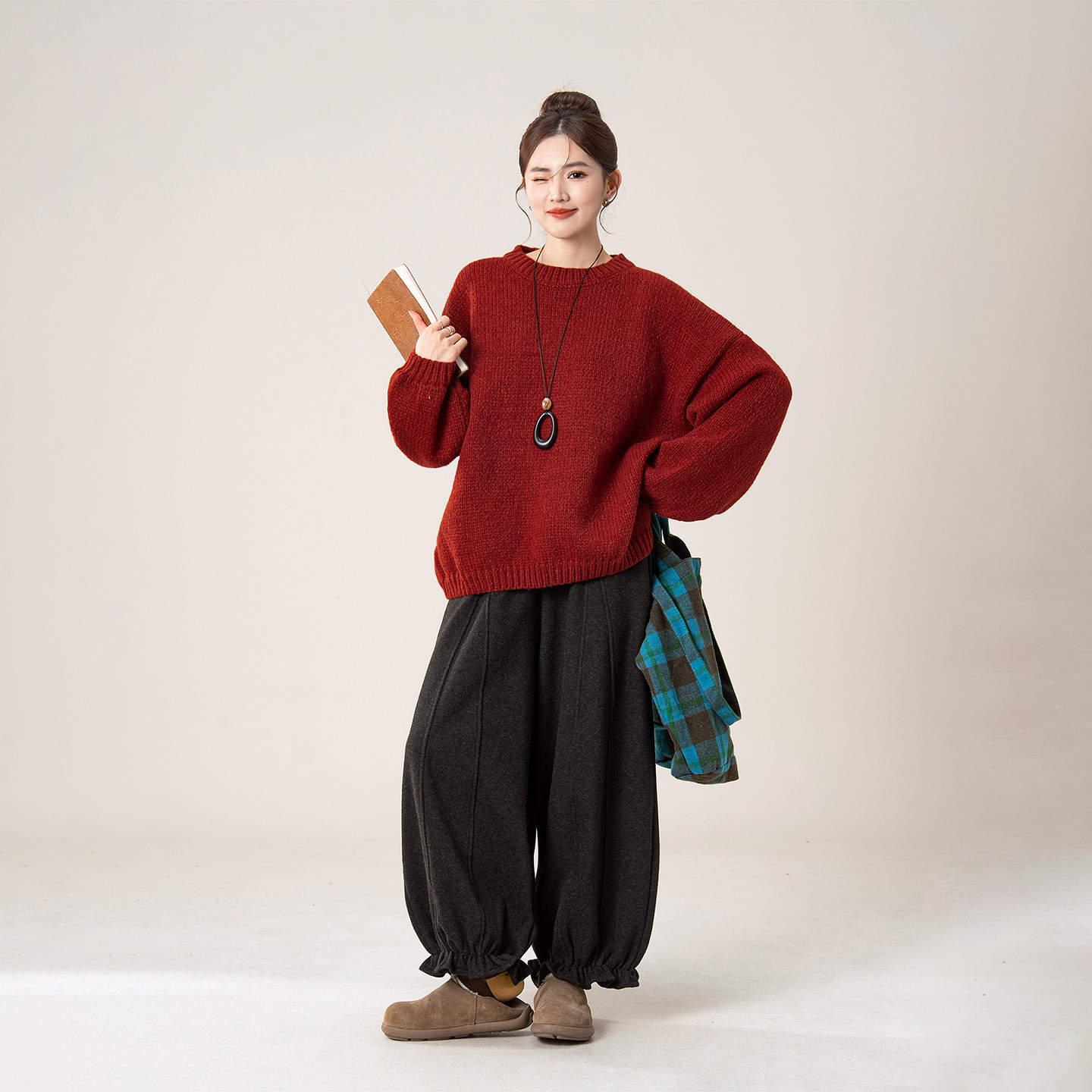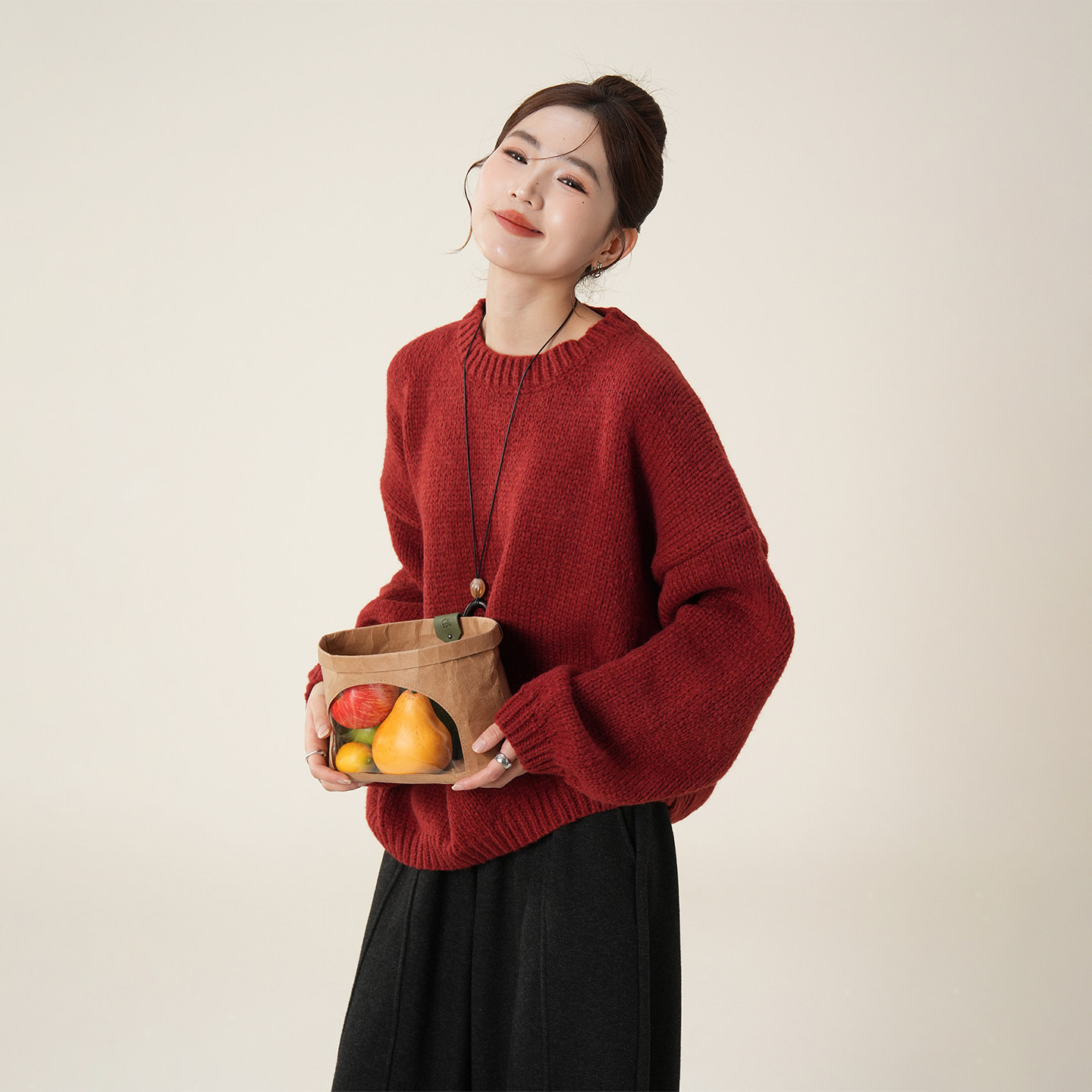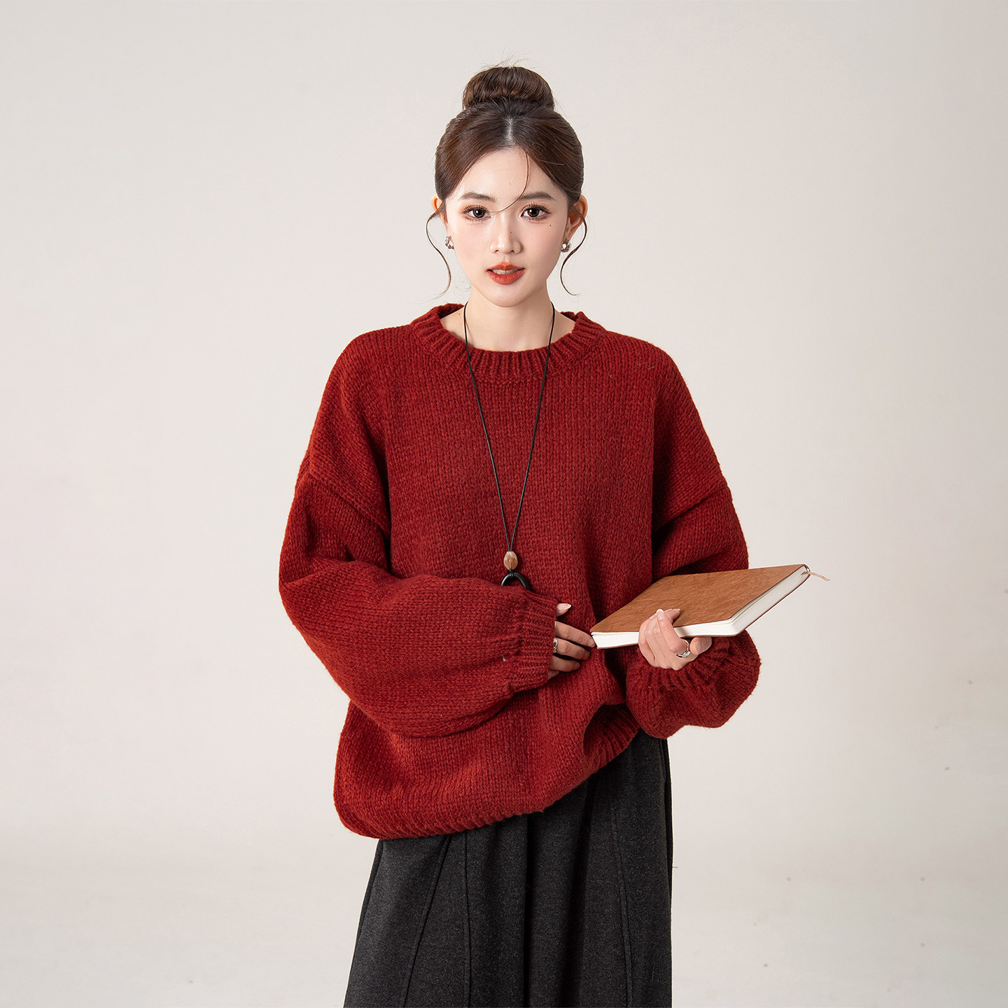 波尔多红宽松慵懒风圆领套头毛衣