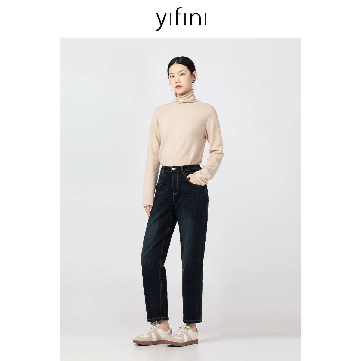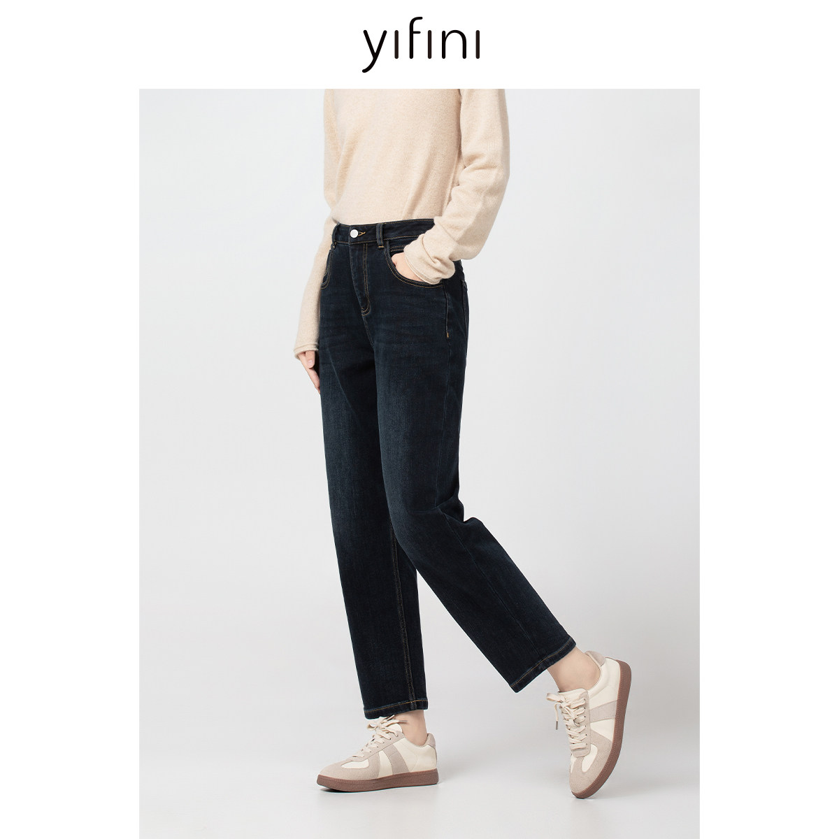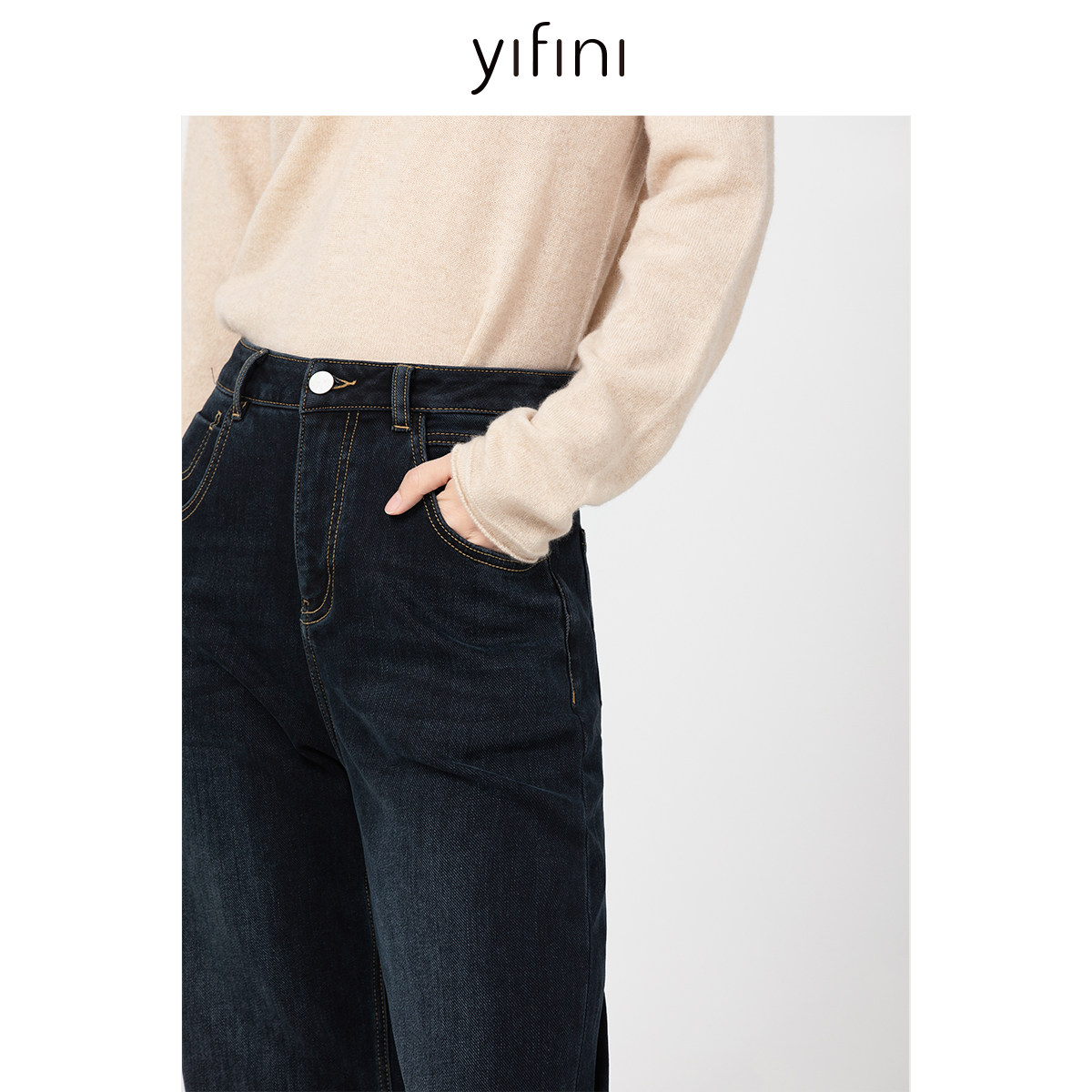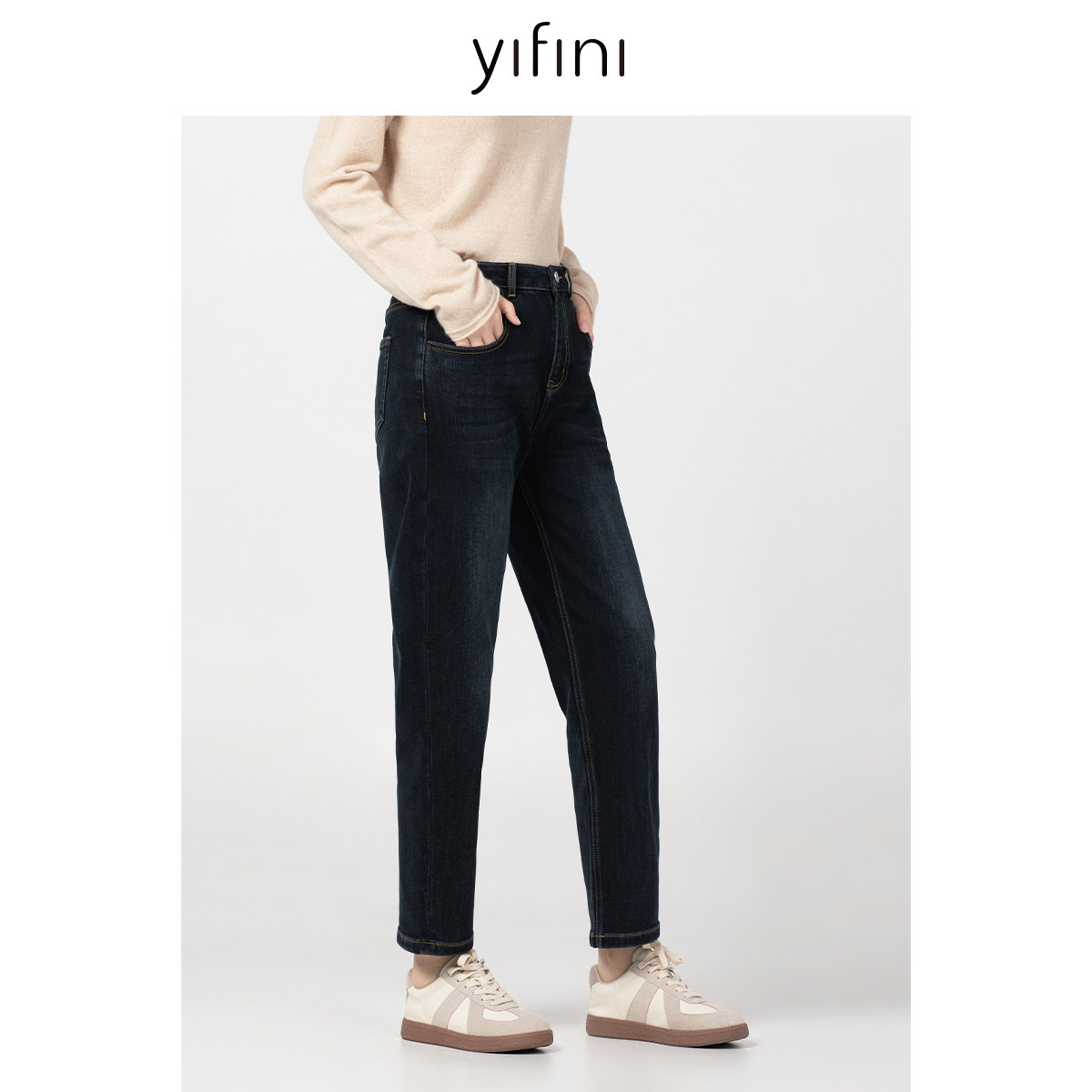 Yifini/易菲复古蓝水洗磨白保暖小脚裤女冬季新款九分牛仔裤