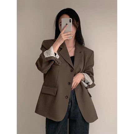 韩国chic春季复古气质西装领单排扣宽松休闲小个子长袖西服外套女