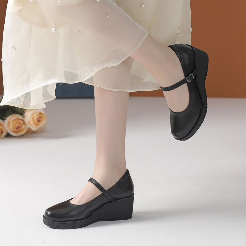 一字扣玛丽珍女鞋真皮坡跟单鞋春秋厚底妈妈鞋软底浅口小码鞋3233