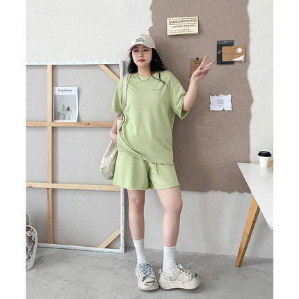 CV大码女装 运动休闲卷边字母印花T恤松紧腰短裤两件套装女夏新款