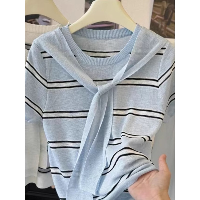 冰丝条纹针织上衣女拼接披肩显瘦圆领短袖T恤夏季新款凉感针织衫