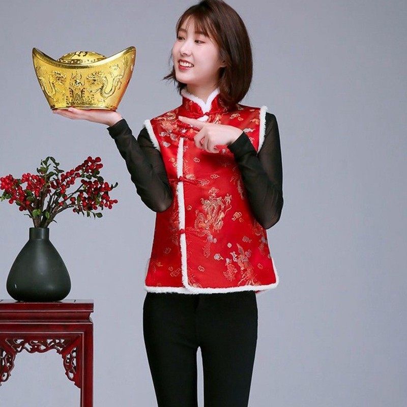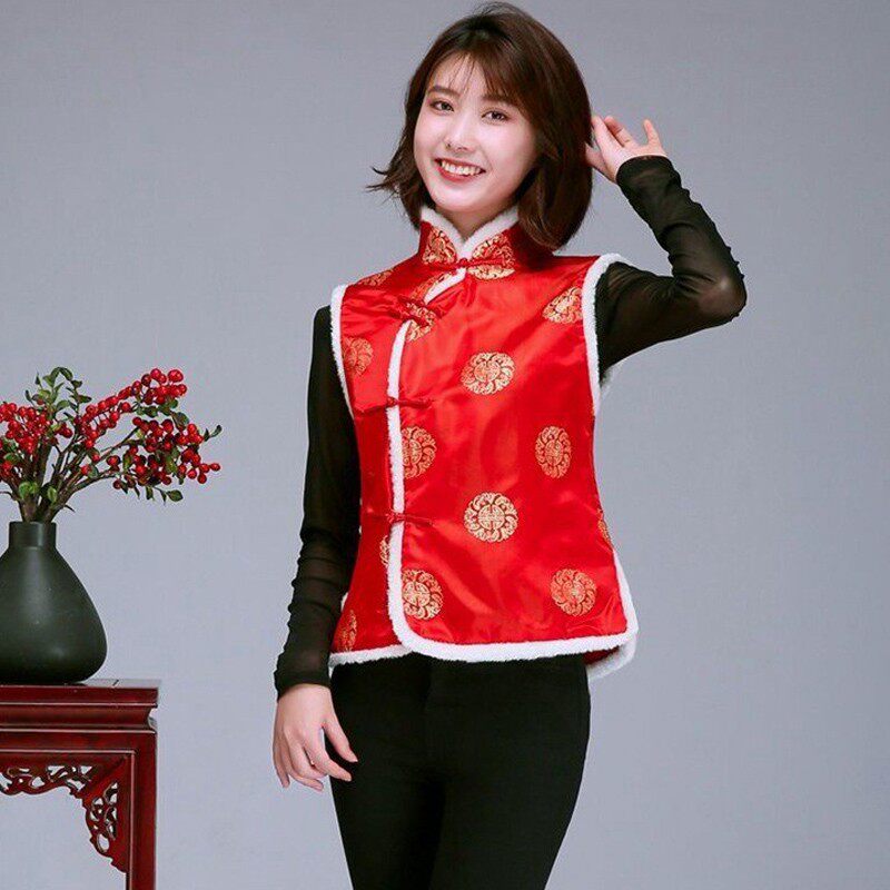 红色马甲女秋冬中国风坎肩酒店庆典喜庆中式棉背心唐装马夹工装