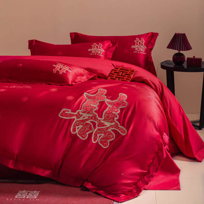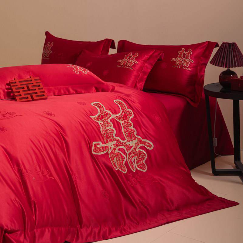 高档结婚四用件套2025婚新款红色喜提花1583被套新婚字庆床单嫁床