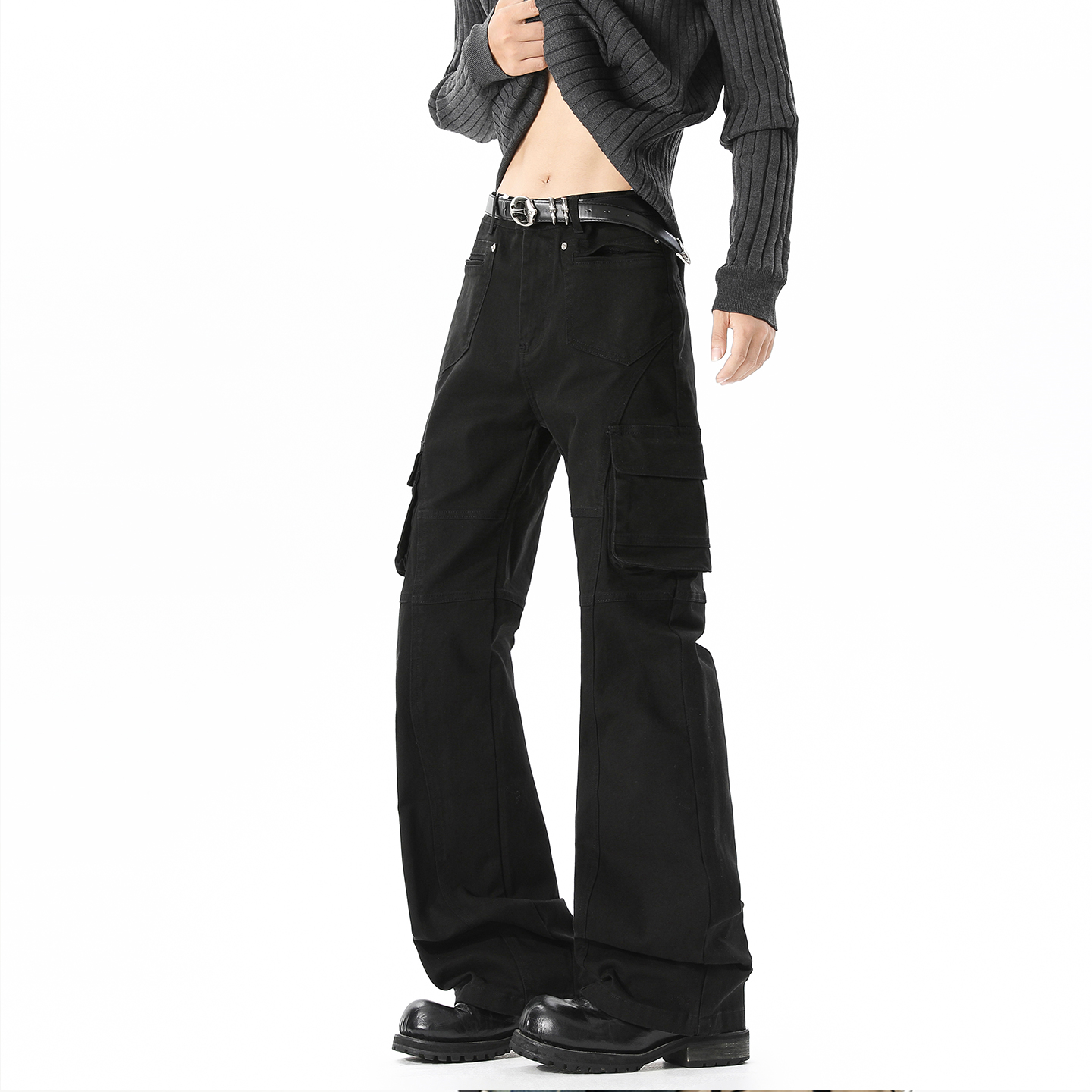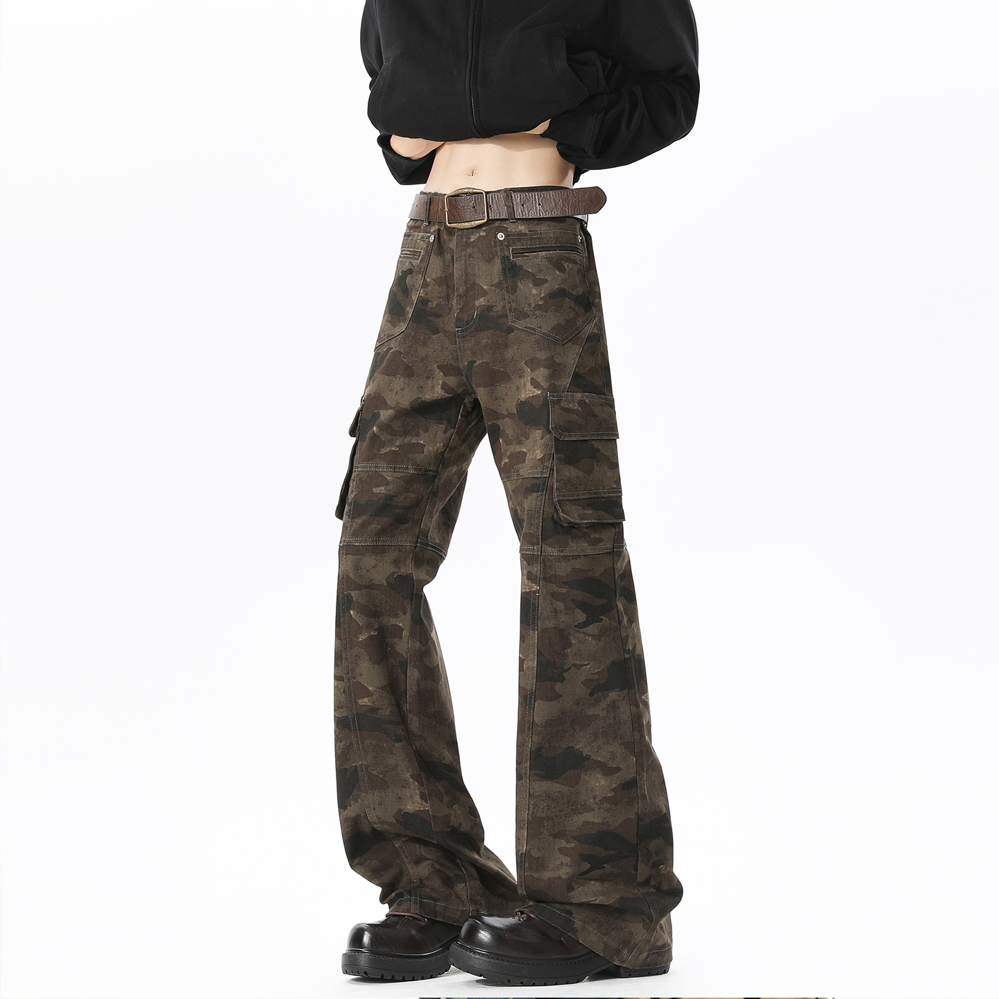 美式高街迷彩多口袋工装裤男生秋季修身显瘦直筒微喇宽松痞帅长裤